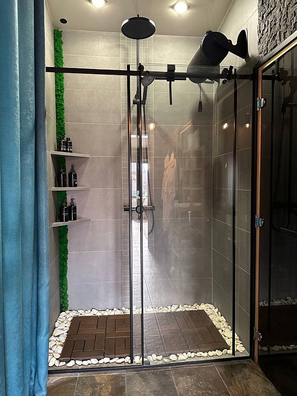 После активного дня вы сможете расслабиться в русской бане с каменной печью, где вас ждут все необходимые принадлежности для полноценного парения. Душевая кабина в тропическом стиле с обливным устройством подарит вам ощущение настоящего водопада, а наборы для душа обеспечат максимальный комфорт.