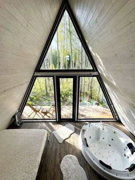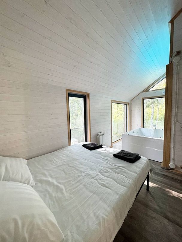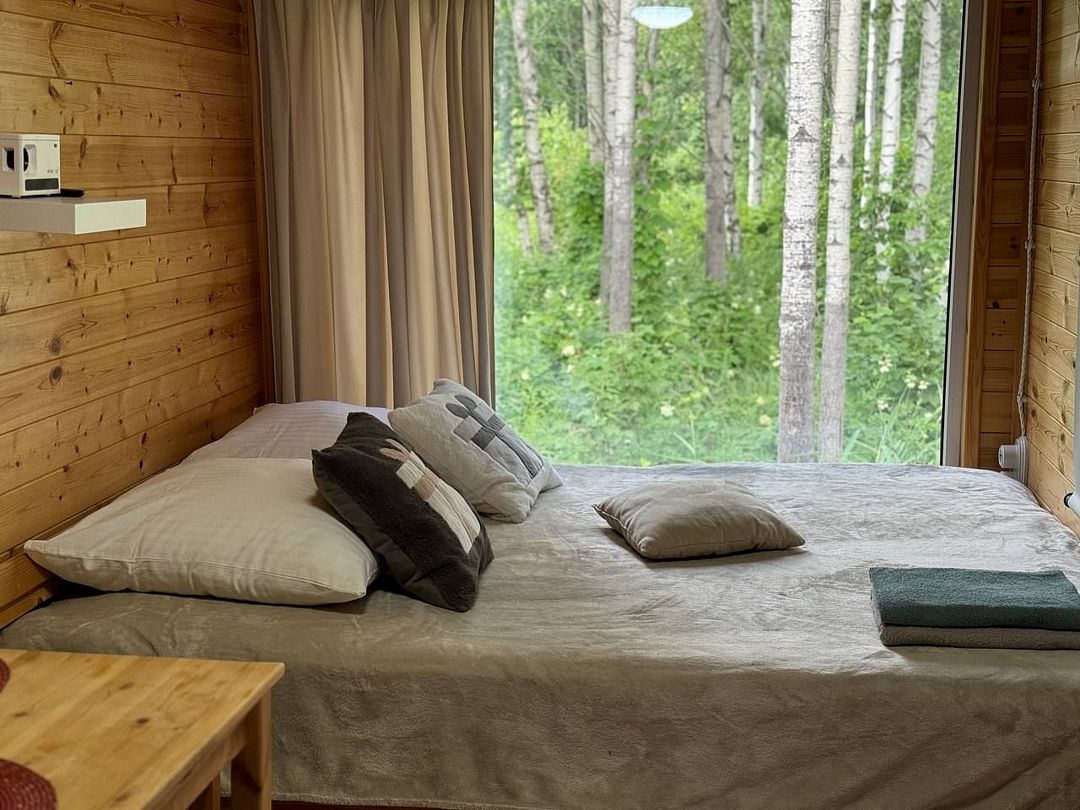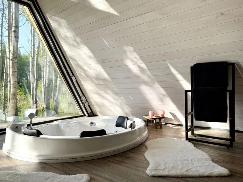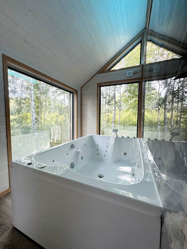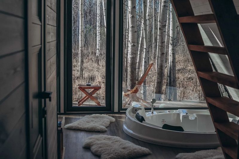 Главная фишка — джакузи с потрясающим видом на березовую рощу в одной из спален.
