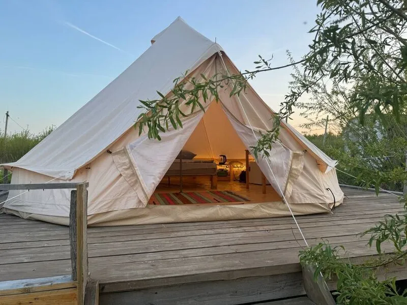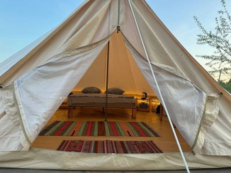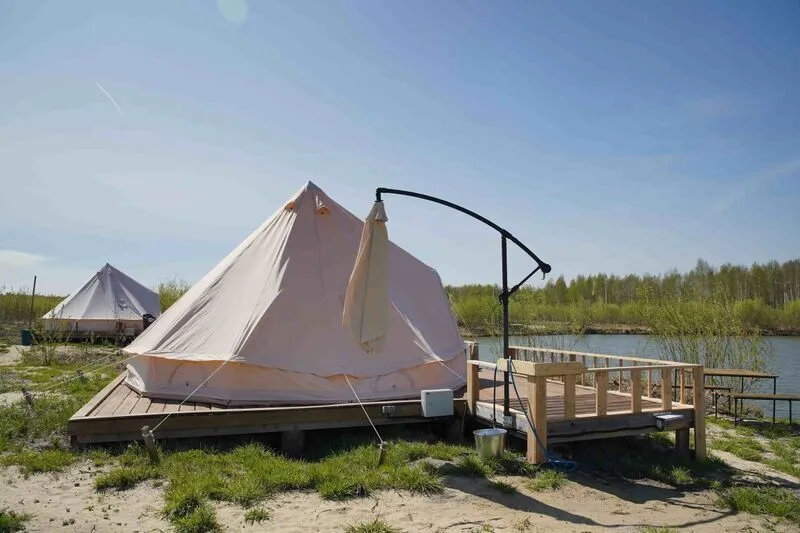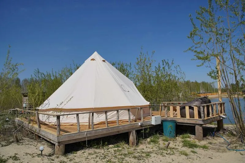 Шатёр на базе отдыха Eco Village в Тюмени предлагает комфортное проживание в окружении природы. Он оборудован всем необходимым для приятного и безопасного пребывания.