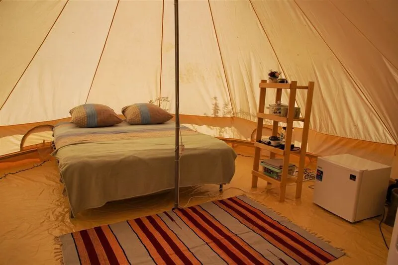 Внутри шатра расположена удобная двуспальная кровать, обеспечивающая спокойный сон после насыщенного дня. Холодильник доступен для хранения продуктов и напитков, позволяя вам сохранить их свежесть и прохладу.