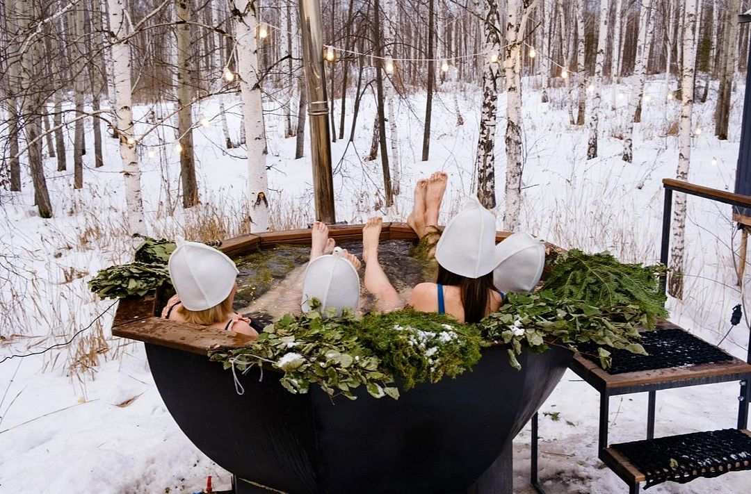 Уютная кедровая баня с горячей купелью. Купание в горячей воде актуально в любое время года. Вас ждут самые искренние эмоции вместе с любимыми людьми и много тепла.