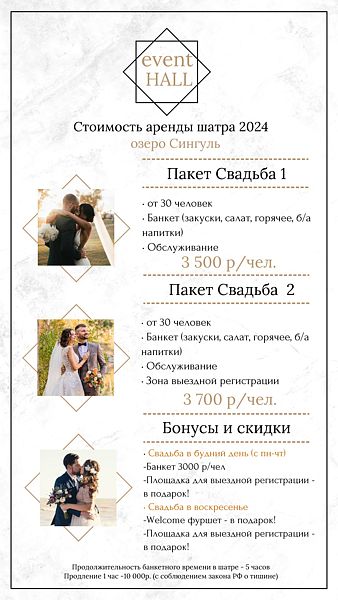 Продолжительность банкетного времени — 5 часов. Продление — 10000 ₽/час. При организации свадебного банкета номер молодоженам — в подарок.