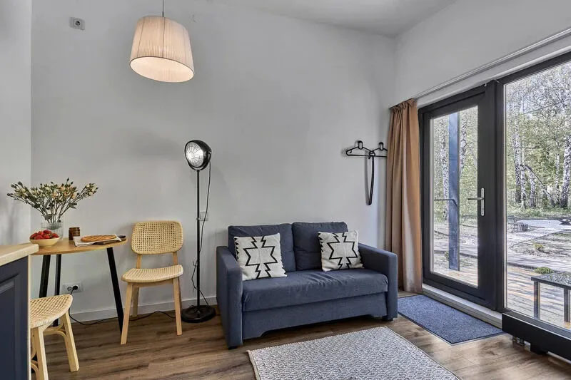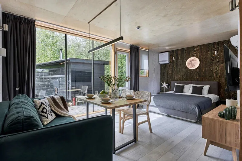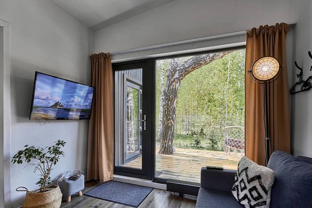 Уютный дом Брауни с панорамными окнами и дизайнерским интерьером в светлых тонах. Полное оснащение домика, комфортное для 4-х человек, своя терраса и много леса кругом.