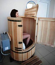Человек помещается в кабине так, что на поверхности остаётся голова, а его тело окутывается паром от настоев панты марала.