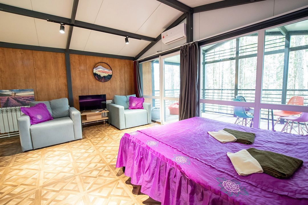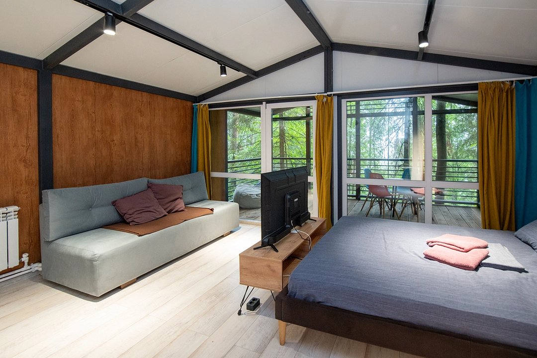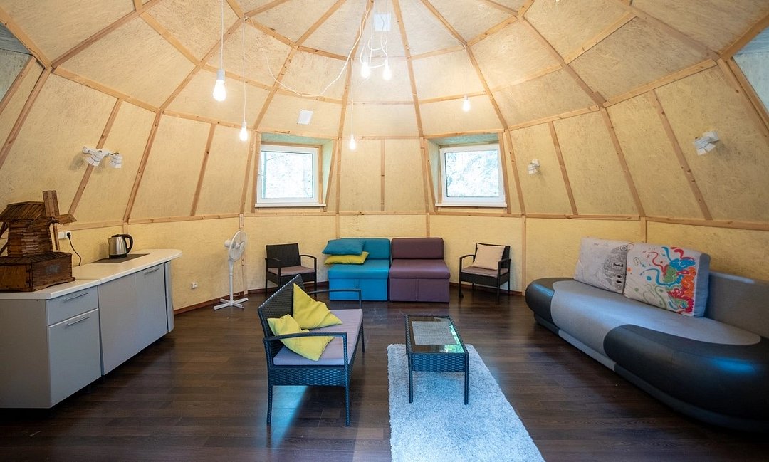 База отдыха раскинулась на просторной закрытой территории, освещенной фонарями, озелененной, с ухоженными тропинками и зонами отдыха. Для проживания предлагается 5 двухэтажных корпусов, 10 одноэтажных домиков смарт хаус, вместительное шале, двухэтажный Генеральский дом и оригинальный домик Хоббита.