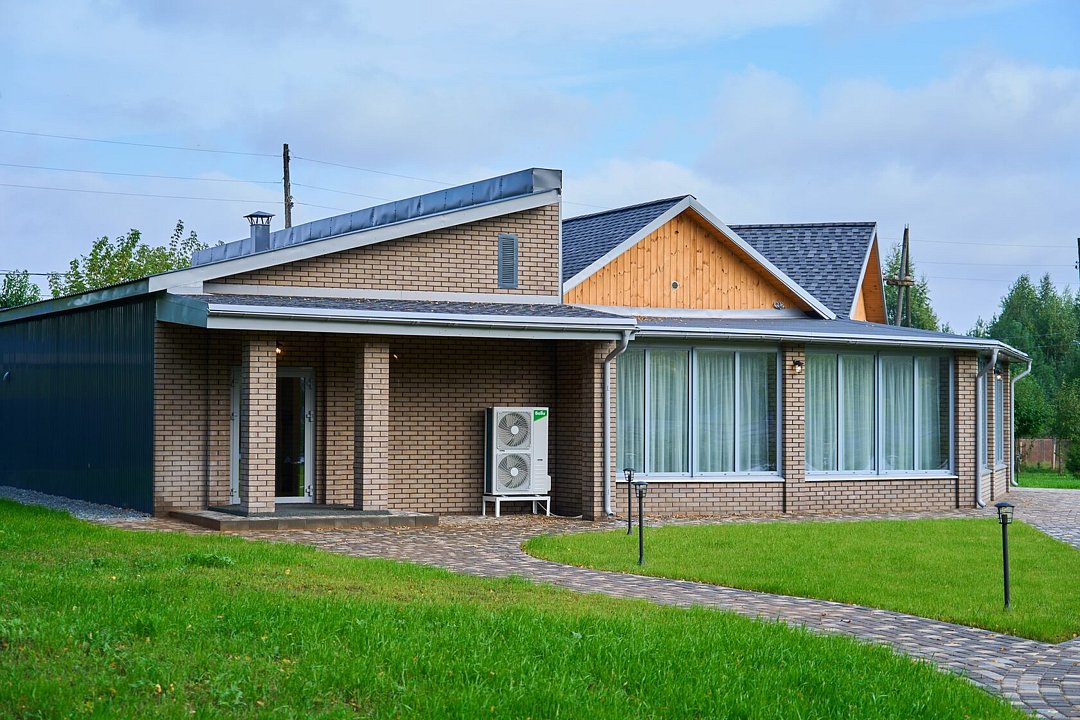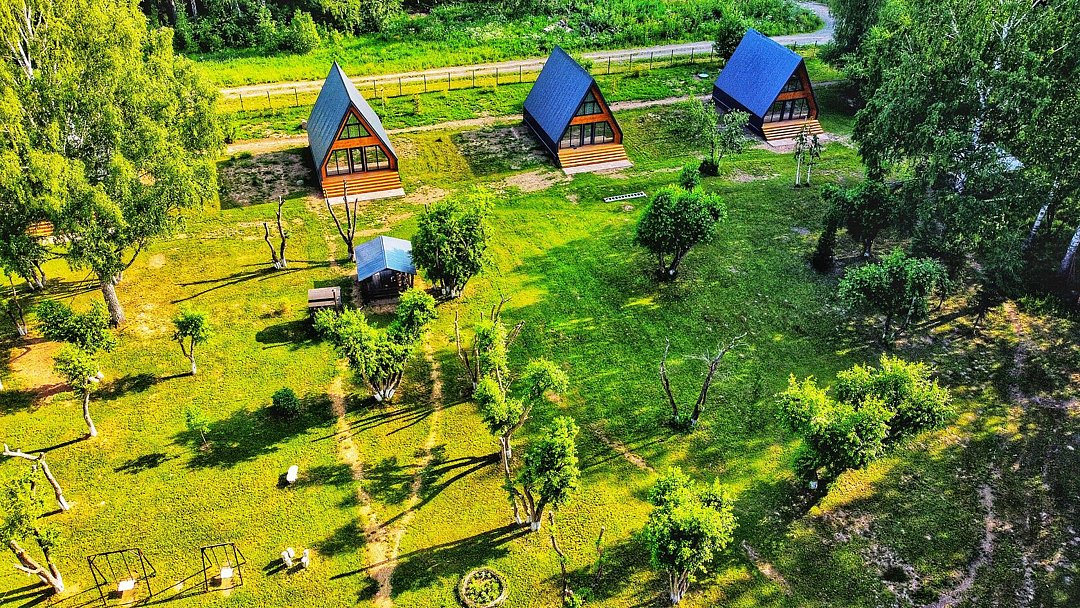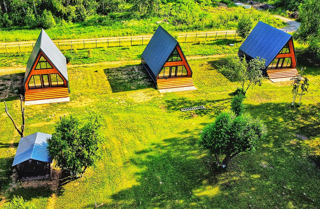 К вашим услугам комфортабельное размещение: просторный коттедж площадью 240 кв.м и три уютных семейных дома в формате А-фрейм.