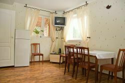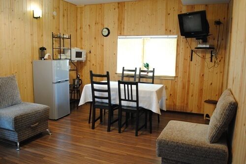 На первом этаже коттеджа гостиная комната с раскладным диваном, большим обеденным столом, телевизором, ресивером со спутниковыми каналами, DVD – проигрывателем, чайником, СВЧ-печью, холодильником. На втором этаже – 2 спальные комнаты с двух и односпальными кроватями.