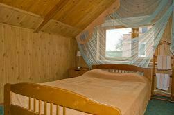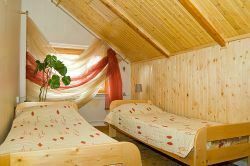На первом этаже удобная, просторная гостиная комната. Замечательно подойдет, как для шумного застолья, так и для тихого семейного вечера. Комната оборудована холодильником, СВЧ-печью, чайником, телевизором, DVD – проигрывателем, ресивером со спутниковыми каналами, музыкальным центром. Второй этаж - исключительно уютные спальные комнаты с деревянной отделкой. 2 комнаты с двуспальными, а также 2 комнаты с двумя односпальными кроватями.