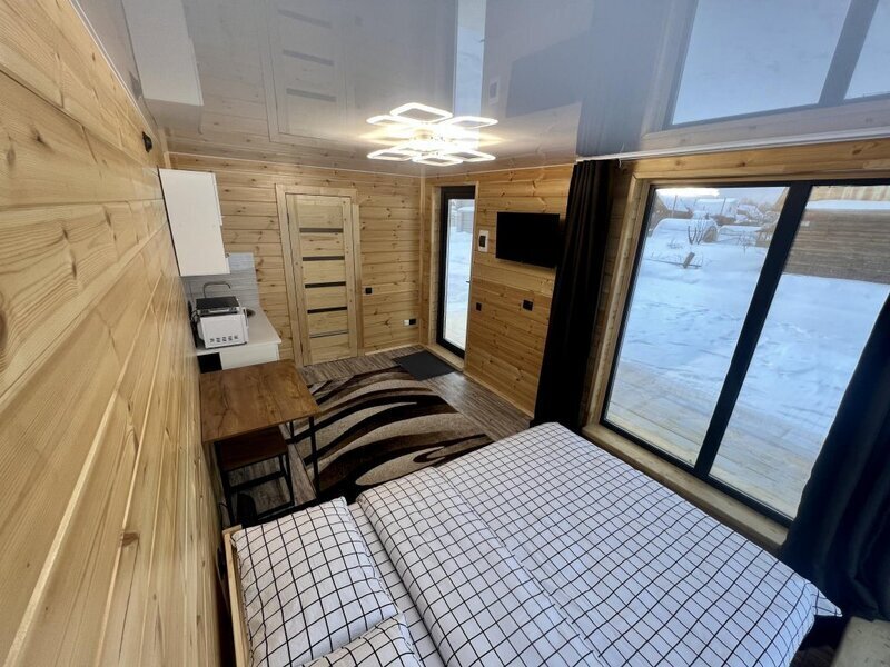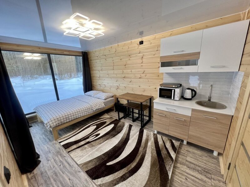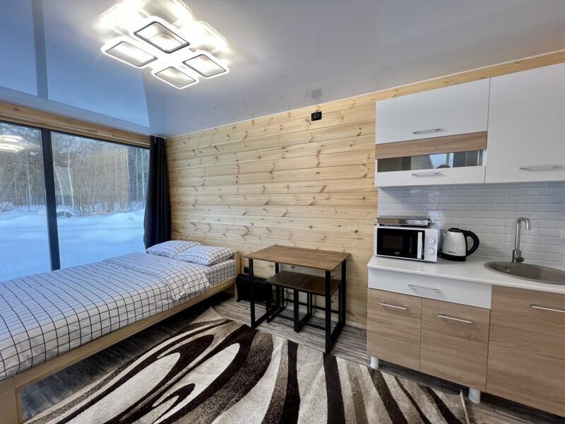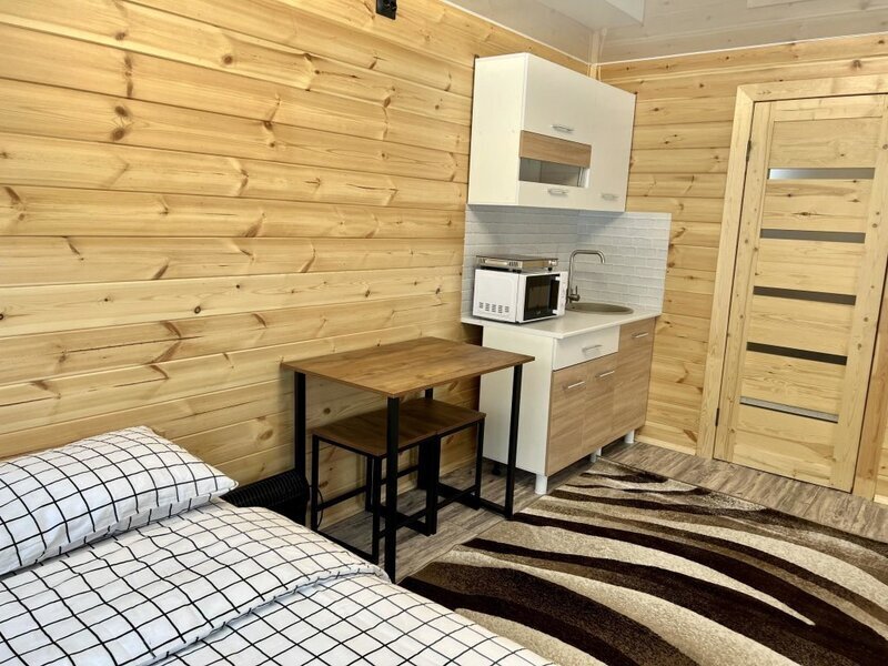 В отеле созданы все условия для комфортного проживания: двуспальная кровать, небольшая собственная кухня, ванная комната.