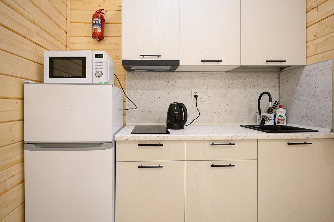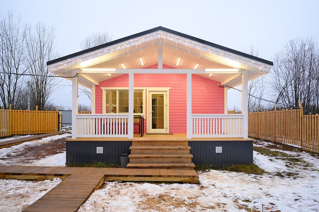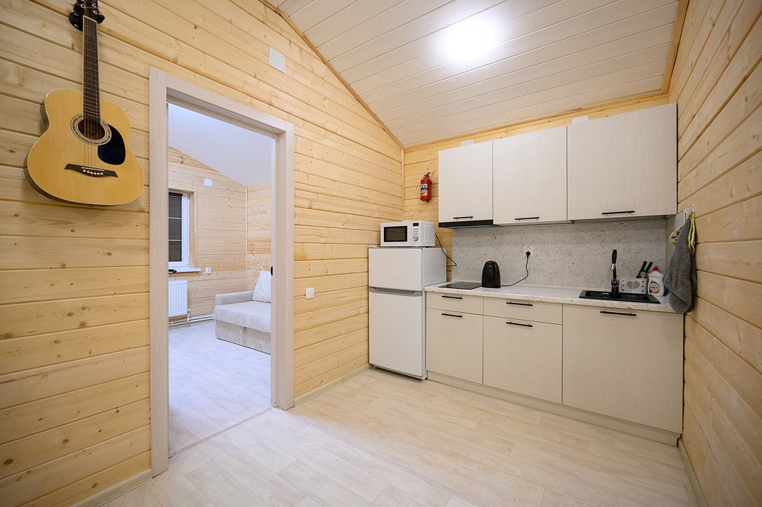 Внутри гостей ждет просторная гостиная с полностью оборудованной кухней: здесь есть Smart TV, музыкальная колонка, вся необходимая посуда, микроволновая печь, электрочайник, холодильник и плита. Отдельная спальня и санузел обеспечат комфортное проживание.