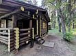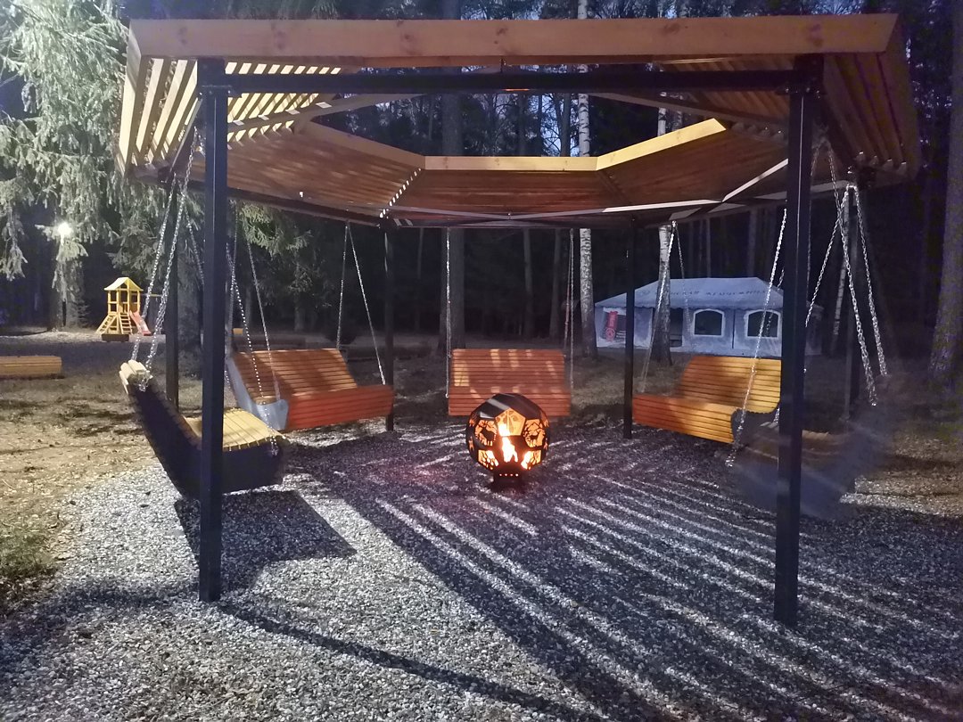 Есть три домика: в каждом по два номера с отдельными входами. За каждым номером закреплена своя мангальная зона. Решетки и шампуры выдают бесплатно. Розжиг и угли можно приобрести у администратора (уголь 200р, розжиг 100р). Над мангалом проведено освещение, так что в темное время суток можно жарить без проблем.
