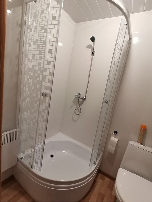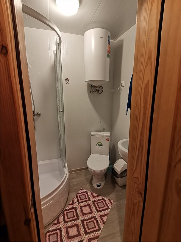 Санузел чистый. Есть душевая кабина и водонагреватель на 50л. С горячей водой проблем не было. Есть базовые принадлежности: шампунь, мыло, гель для душа, туалетная бумага. Полотенца тоже выдают.