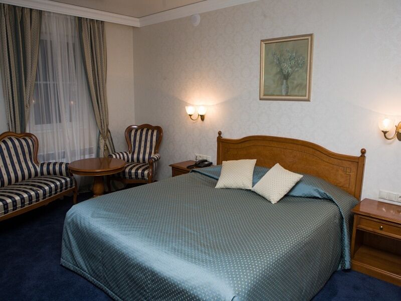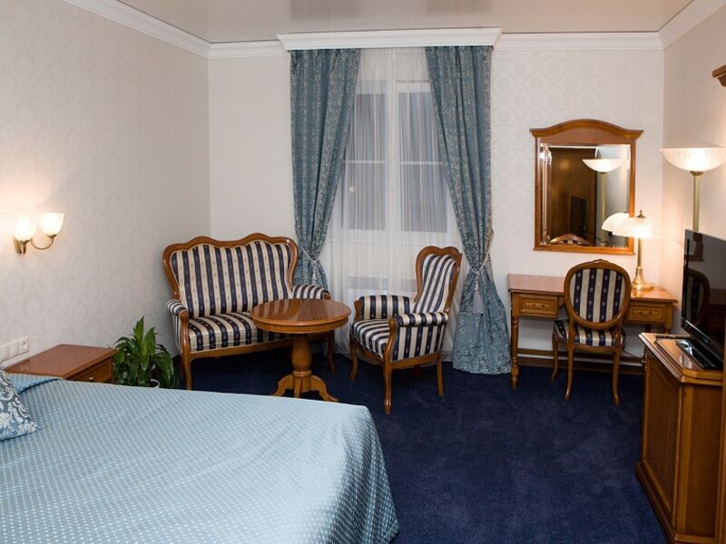Гостиничный комплекс занимает благоустроенною территорию площадью 2,5 гектара с собственным парком. Современное здание отеля выстроено в формах, напоминающих замковую архитектуру. На втором этаже располагаются уютные и двухместные номера категории Стандарт и Люкс. Просторные номера хорошо меблированы — в каждом качественная мебель из итальянского бука. Комнаты укомплектованы необходимой техникой — есть телевизор, мини-холодильник, кондиционер. Все номера оснащены санузлом с ванной, в Люксах есть джакузи.