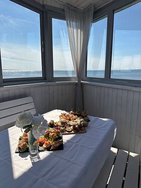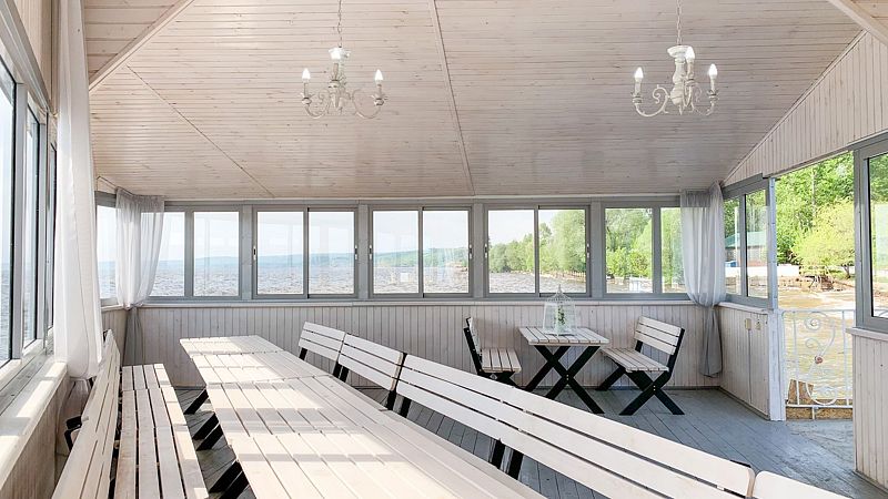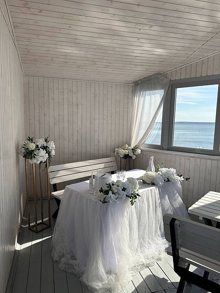 «Адмирал» предлагает эксклюзивную беседку на 36 мест, расположенную непосредственно над рекой и выполненную в элегантном белоснежном оформлении. Доступная для аренды с 13:00 – 23:00, ее стоимость составляет 21000 ₽, а почасовая ставка за продление — 2500 ₽.