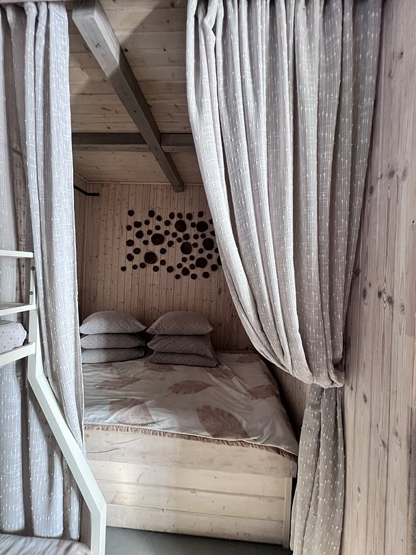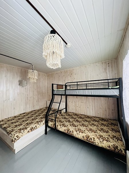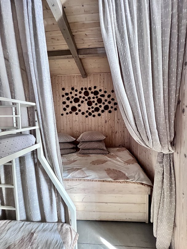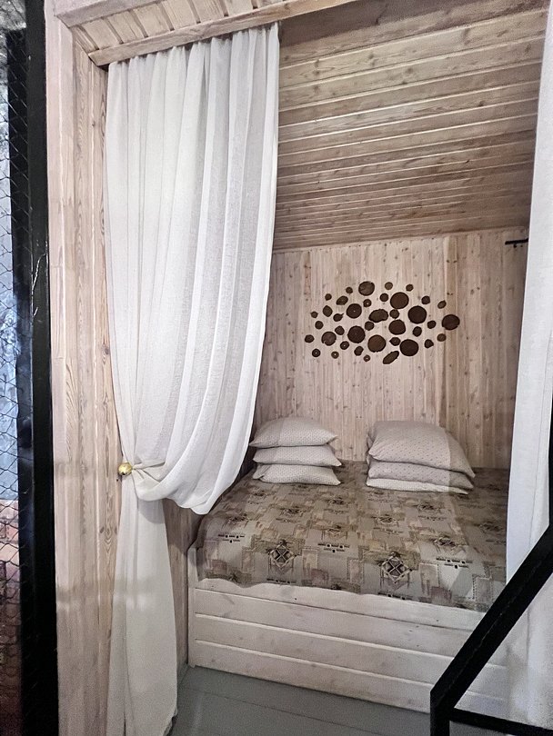 НедостаткиРасположение кроватей в доме , не очень комфортно всем спать лицом в одну кучу, а ногами не получится, т.к. изголовье двухствольной кровати спрятано за двухъярусной