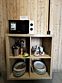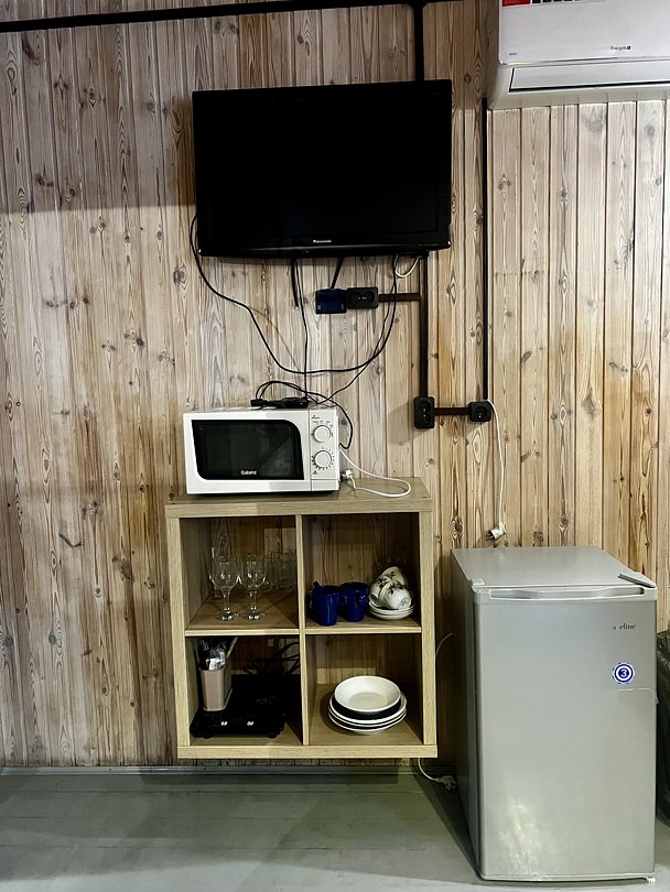 - В номере : кондиционер, СВЧ, мини холодильник , ТВ , чайник, посуда , столовые приборы, тостер, электрическая плитка. Утюг и гладильная доска по запросу бесплатно. Детская кроватка и стульчик для кормления бесплатно по запросу.