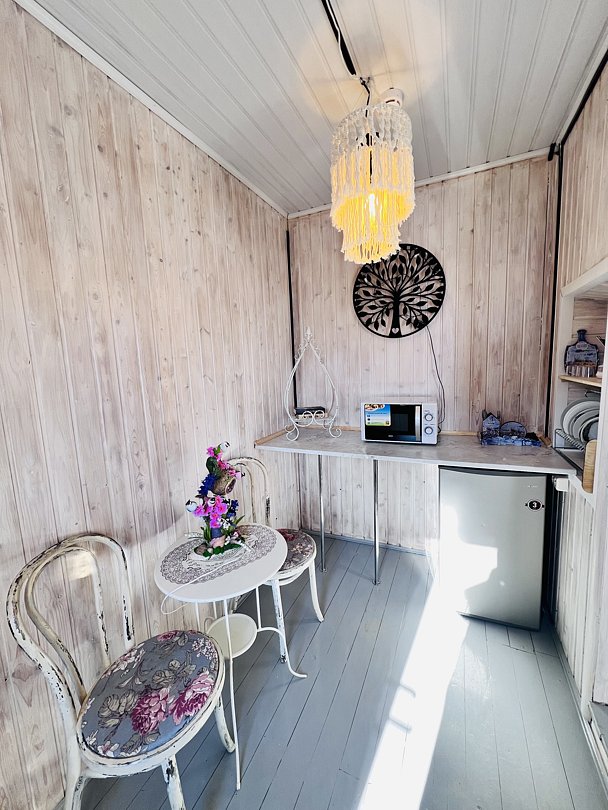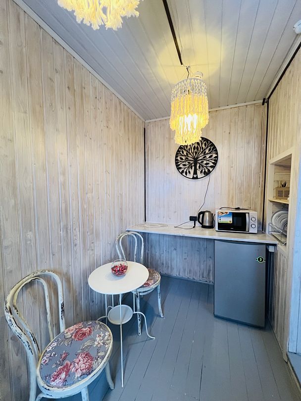 В номере : СВЧ, мини холодильник, ТВ, чайник, посуда , столовые приборы, электроплитка, тостер. Утюг и гладильная доска по запросу бесплатно. Гостям предоставляется постельное белье, полотенца, гель для душа. Номер расположен на 1 этаже. Рядом настоящая русская баня на дровах с вениками и кедровый банный чан с травами (за дополнительную плату). Удобный мангал и зона отдыха на улице перед домиком. Охраняемая закрытая территория, комфорт и безопасность.