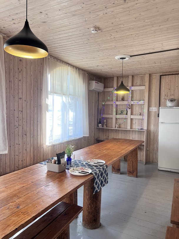 - Всего 2 комнаты, большая столовая и общая спальня. Около домика мангал бесплатно. Можно жарить шашлык, приготовить уху и плов. Казан и решетки барбекю можно взять в аренду. В доме туалет с раковиной, душ и унитаз.