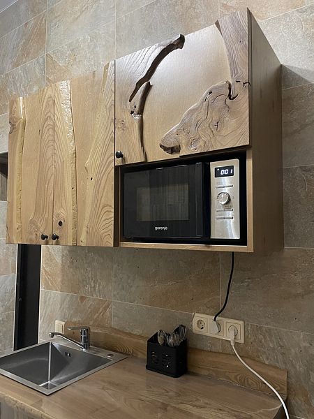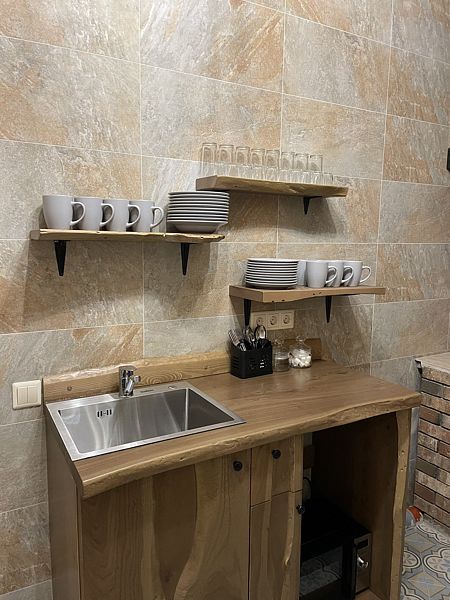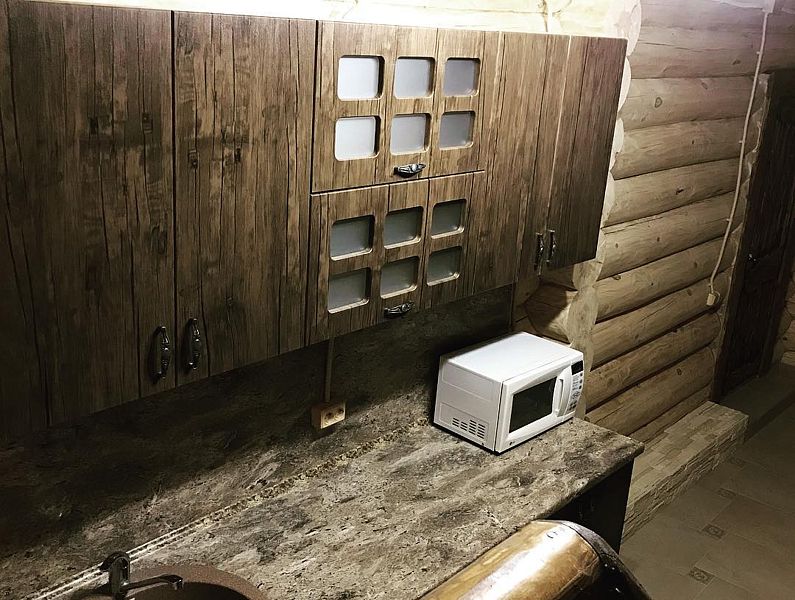 - кухонный уголок с микроволновой печью, раковиной и прочей кухонной утварью;
