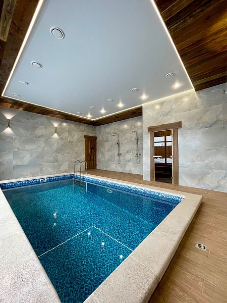 - большой бассейн с кристально чистой постоянно фильтрующейся водой, в котором можно охладиться после жарких парных процедур;