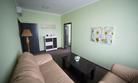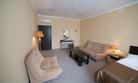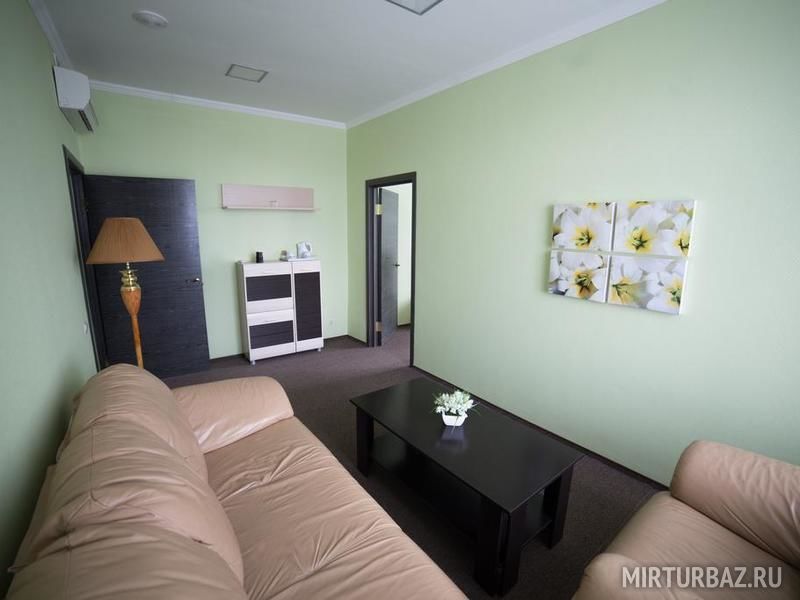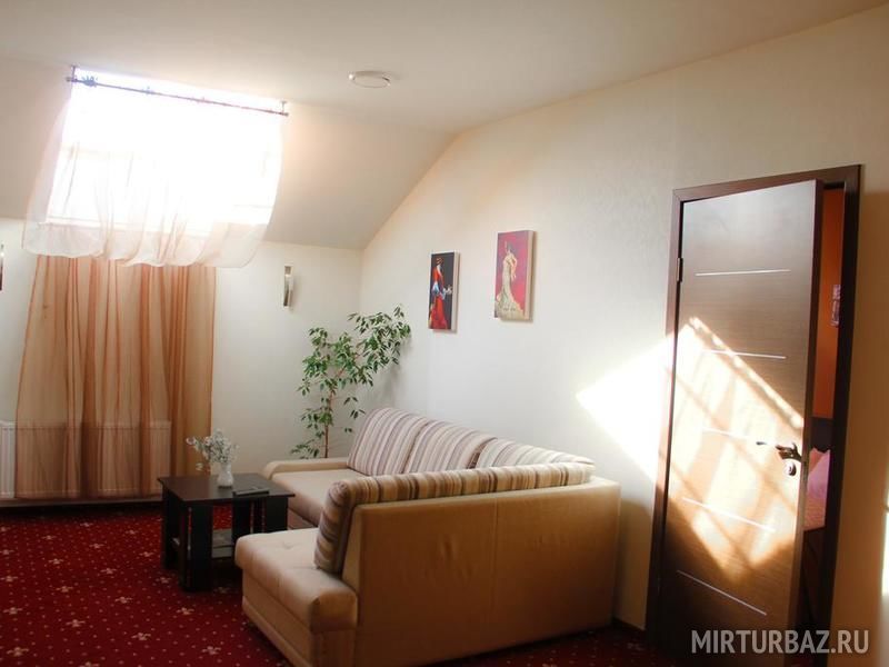 В люксе есть гостиная с диваном и журнальным столиком.
