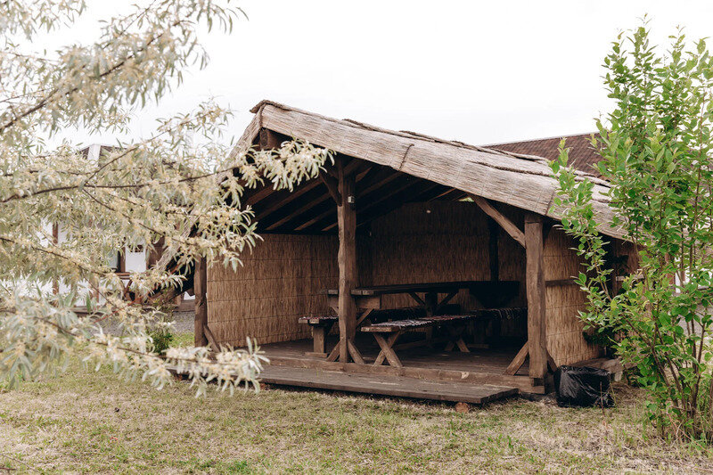 Беседка №1. Закрытая беседка до 55 человек. Площадь беседки 63 кв. м, имеются столы и лавки. Предусмотрена мангальная зона. Время бронирования: 12:00-22:00.