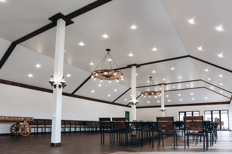 Просторный зал с витражными окнами, зона кухни, кондиционер, wi-fi, площадка для церемоний. Вместимость гостей: до 120 человек. Идеально для свадебных торжеств, юбилеев, выпускных, корпоративов, конференций.