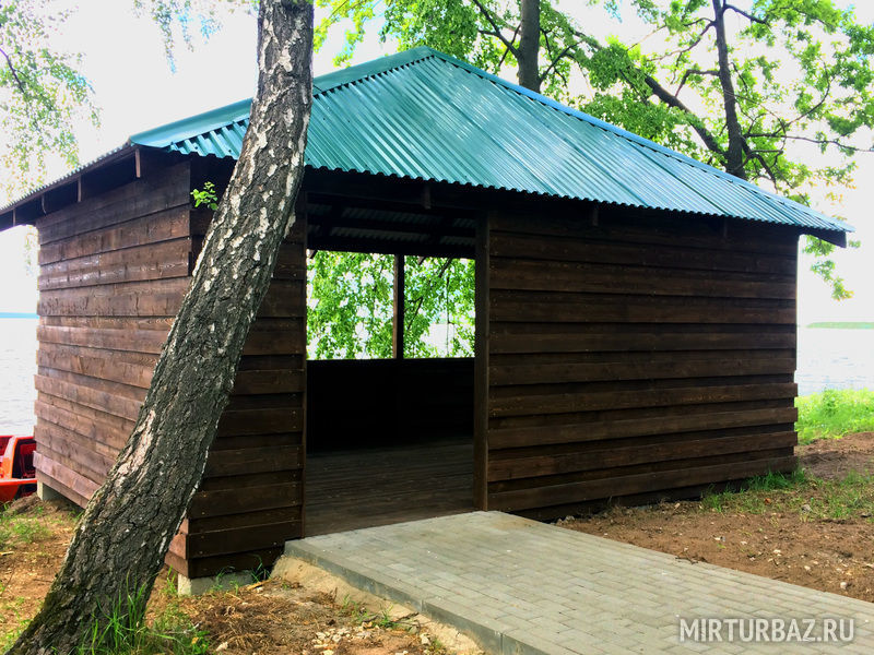 Уютные деревянные беседки на берегу Волги или возле пруда, идеально подходящие для отдыха дружной компанией и приготовления шашлыка.
