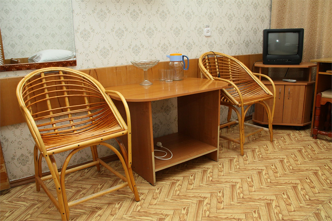 В номере имеются две кровати, шкаф, стол, стулья.