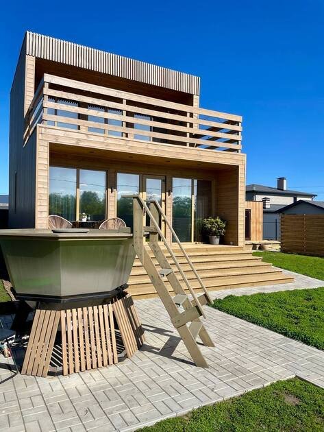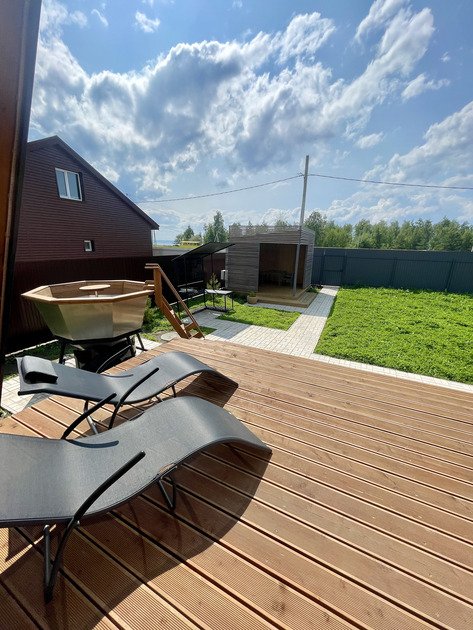 Стильный Cube House с большой террасой рассчитан на размещение до четырех гостей. Возле дома расположен банный чан, мангальная зона, беседка.