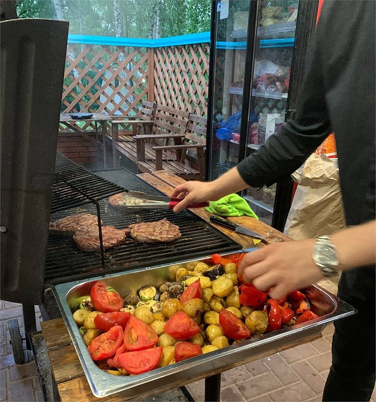 Полностью оборудованная гриль-зона: шампура, решетки, мангалы, бочка гриль, казаны, подвесы для казанов, термометр для мяса и всякие штучки для гриля.