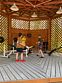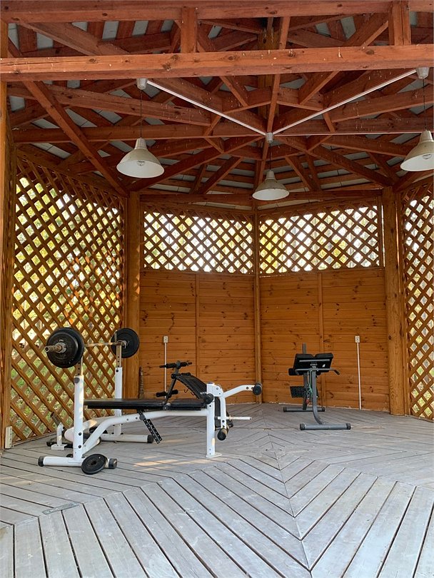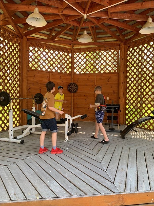 Небольшая ламповая площадка, где есть тренажеры для выполнения базовых упражнений, коврики для йоги, спортивные резинки, дарс, гантели, скамьи, скакалки.