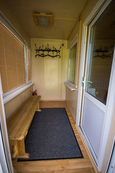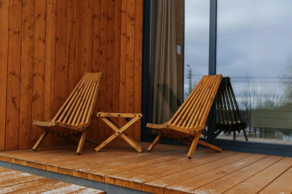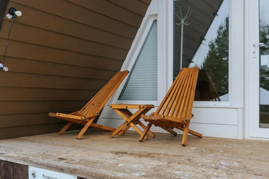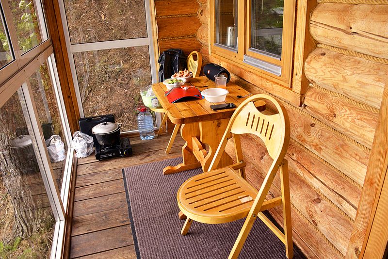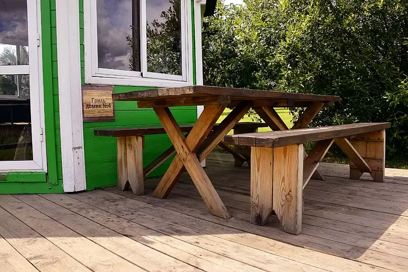 Терраса также оборудована столом и лавками, а также мангалом, что позволяет гостям наслаждаться свежим воздухом и приготовить еду на открытом огне.