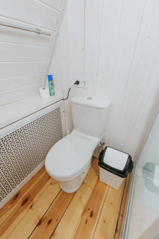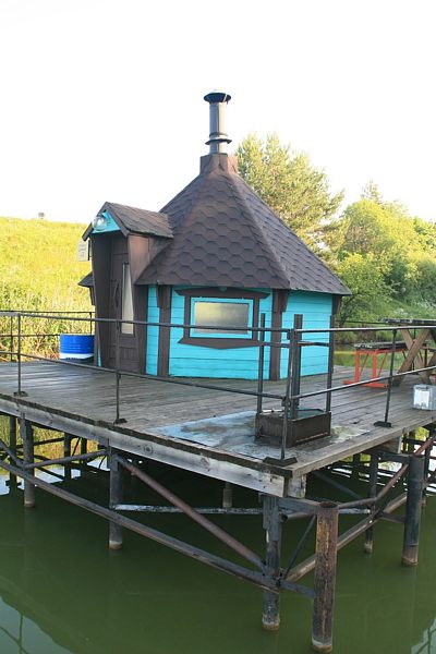 Так как домик находится на берегу водоёма, в нём отсутствует водоснабжение (гости привозят с собой воду в бутылках), а туалет находится на улице за домиком (биотуалет в пластиковой кабинке).