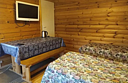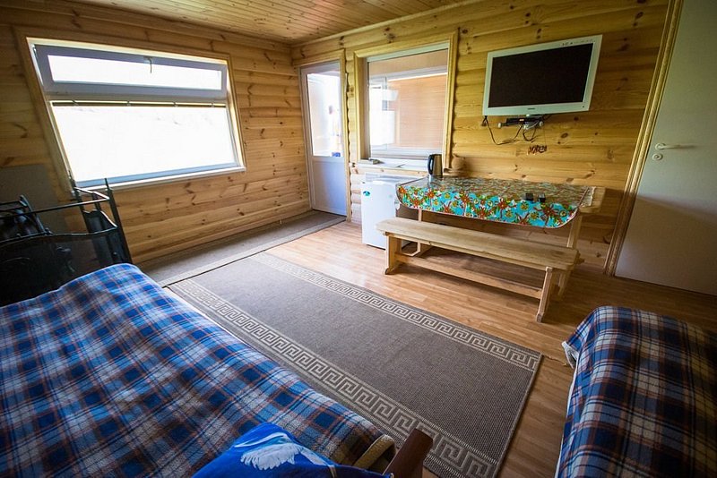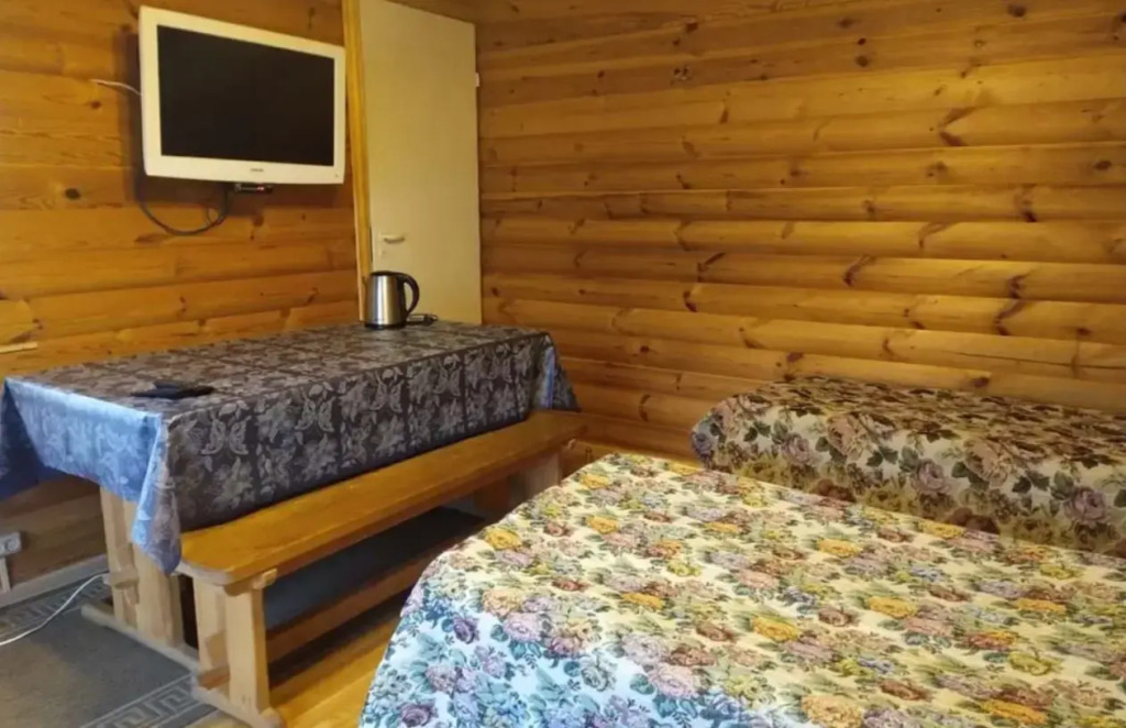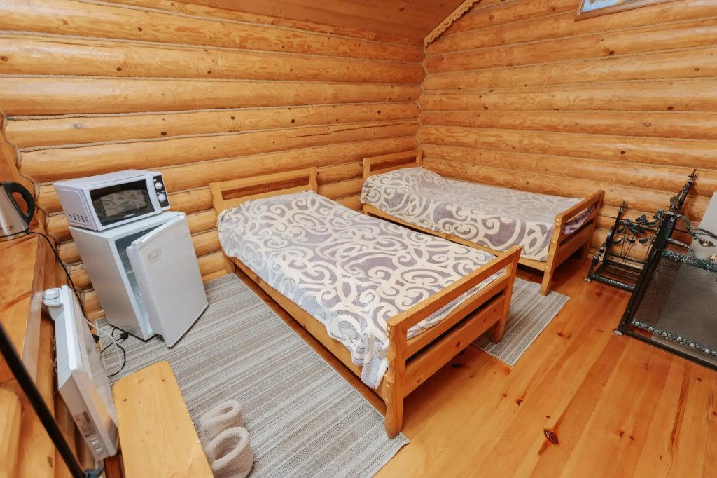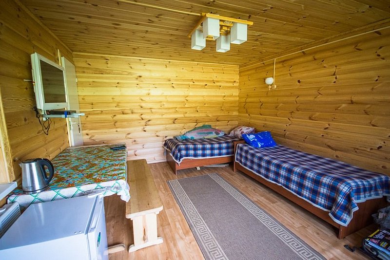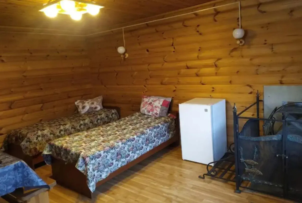 В спальном домике №1 : 2 односпальные кровати с чистым заправленным постельным бельём, электрический обогреватель, электрический чайник, небольшой холодильник, дровяная печка, столик, стульчики, мангал.