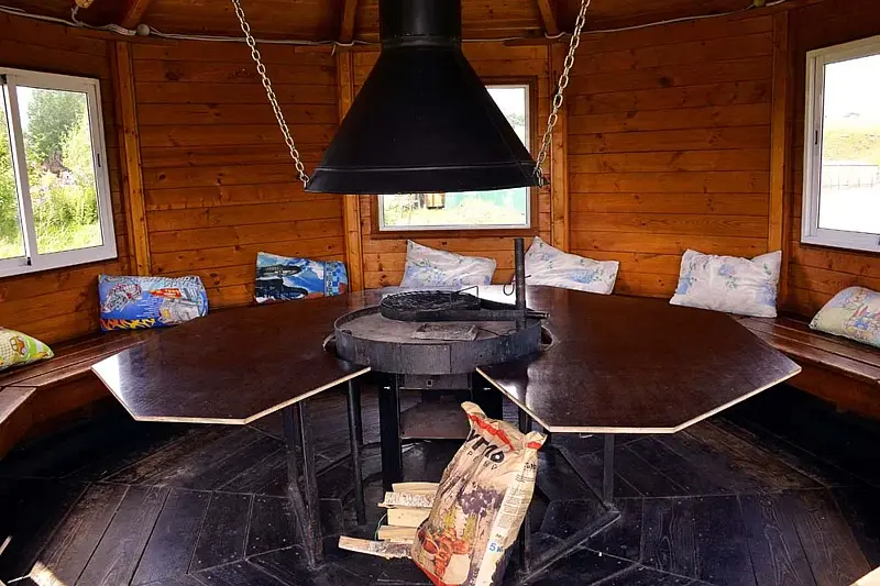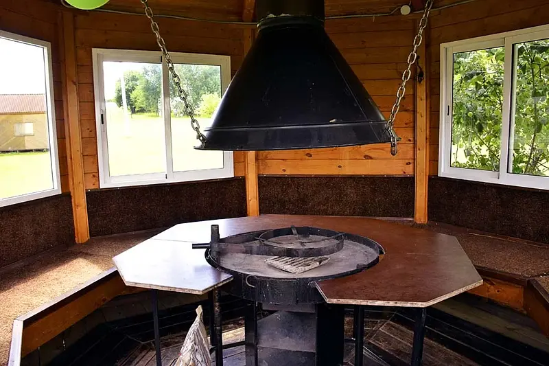 Внутри домика находится очаг, вокруг которого расположены лавки на 10 человек. Это создает удобное пространство для общения и наслаждения пищей, приготовленной на гриле.