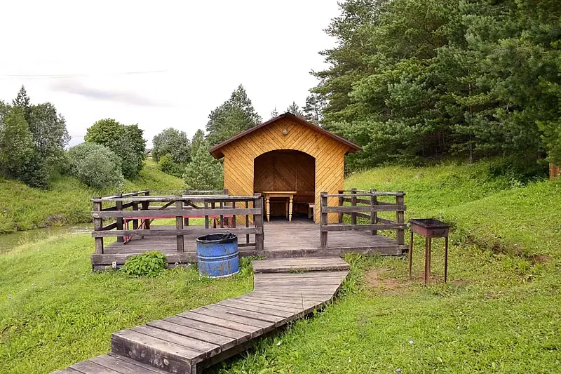 Рядом с беседкой оборудована площадка со столом и лавками, а также мангалом, что позволяет гостям наслаждаться свежим воздухом и приготовить еду на открытом огне.