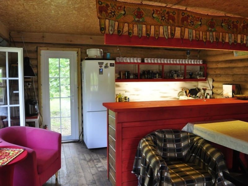 Тут есть все необходимое, чтобы приготовить еду как дома: плита, холодильник, термопот, большой барный стол и поменьше для детей, уютные диванчики и кресла. Рядом на улице мангал, жаровня для казана, место для костра.
