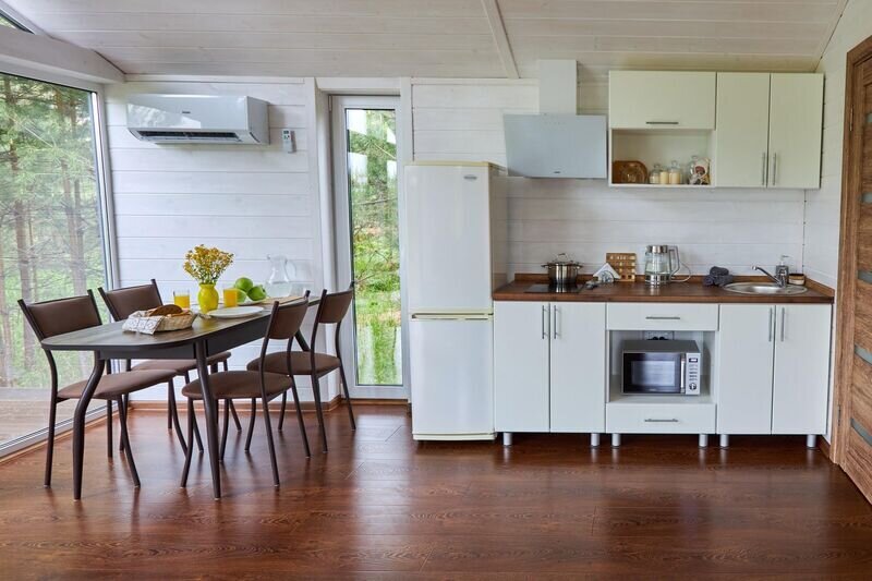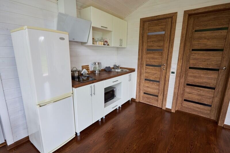 2. Удобная небольшая полноценная кухня содержит все необходимые приборы: плита, холодильник, микроволновая печь, столовая посуда и приборы, чайник, заварник, родниковая вода.