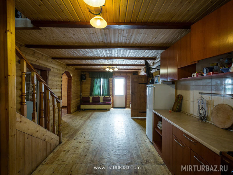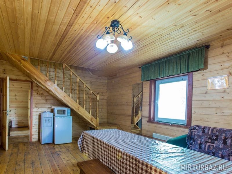 - Гостиная совмещённая с кухней (диван на 2 человек, банкетный стол, лавки, холодильник,телевизор, муз. центр, караоке, кулер, микроволновка, наборы различной посуды, газ.плита с духовкой);