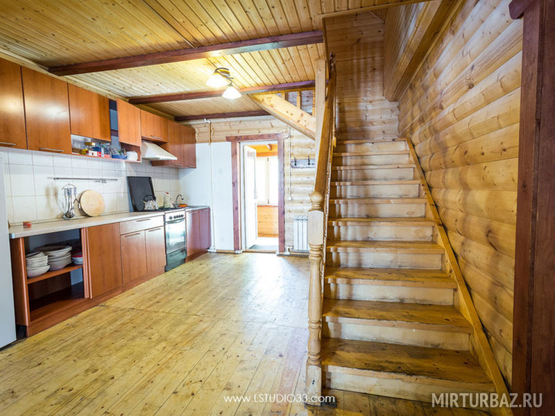 На 1 этаже: полностью оборудованная кухня-гостиная (2-спальный диван).