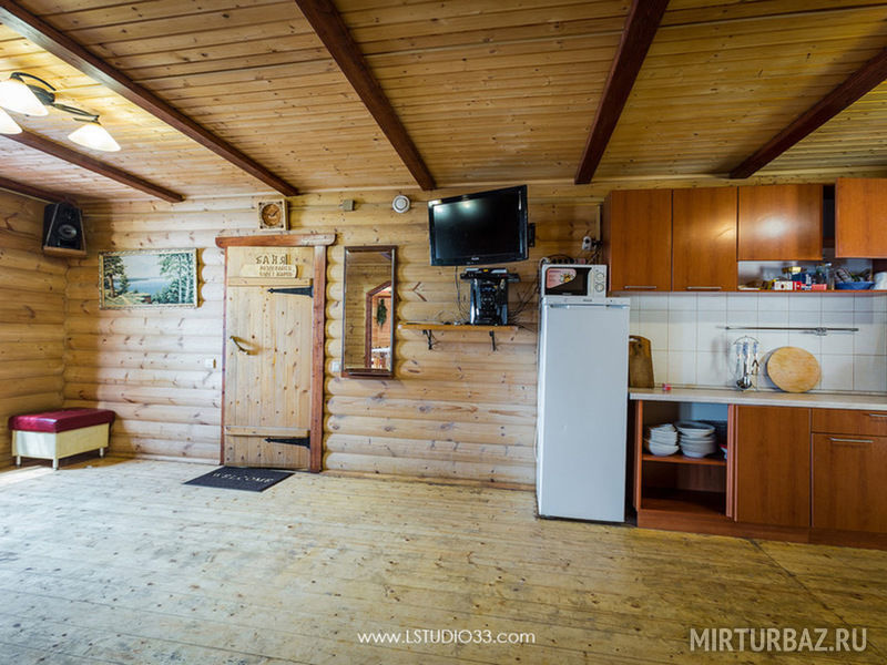 - Гостевой зал на 12–15 человек: камин, раздевалка, музыкальный центр, телевизор, караоке;