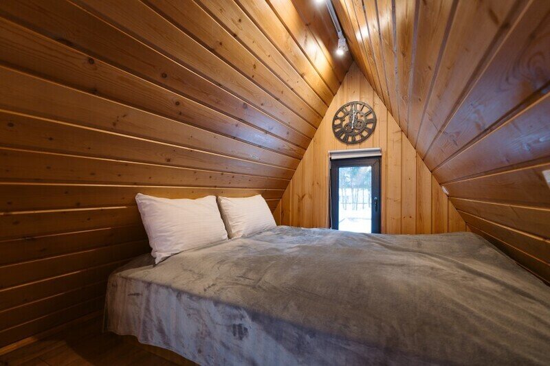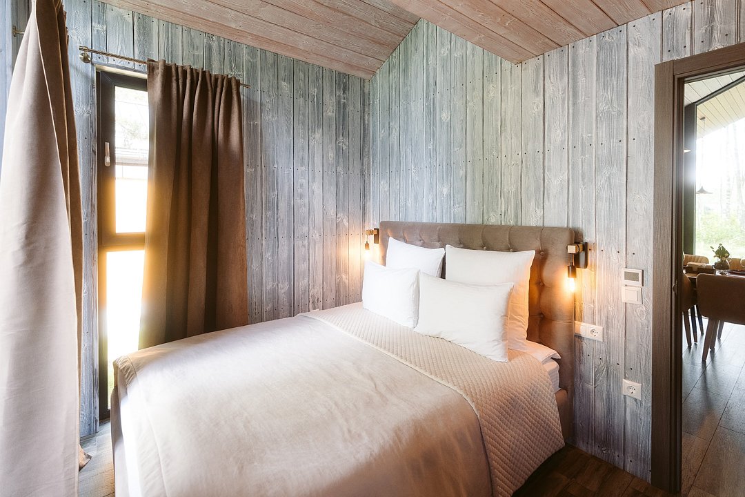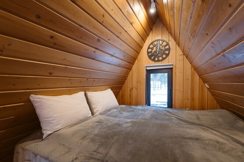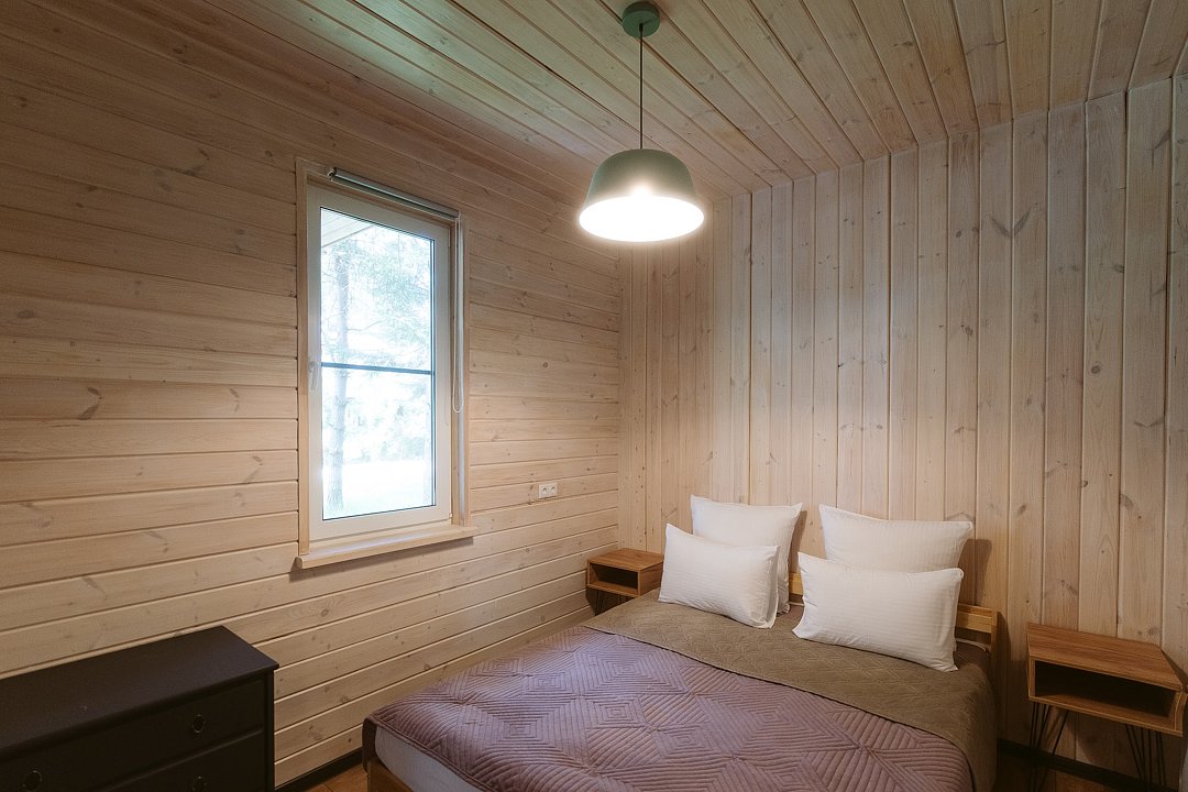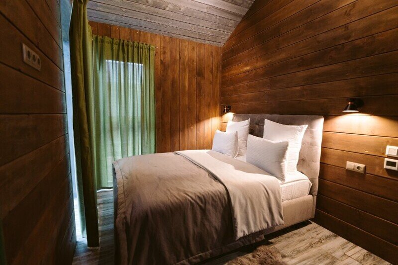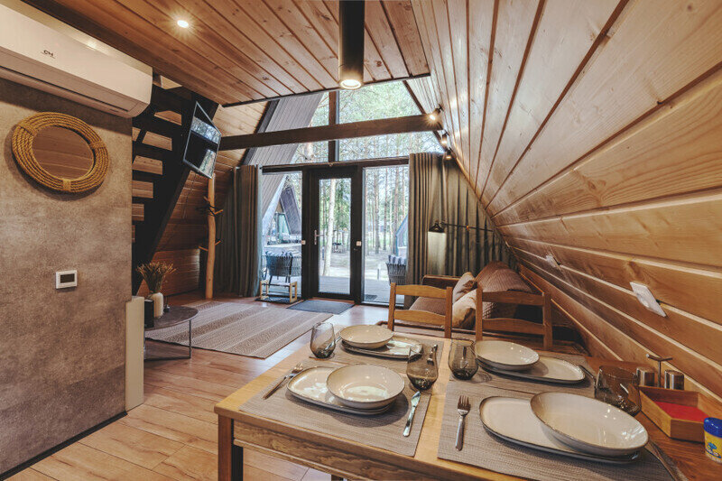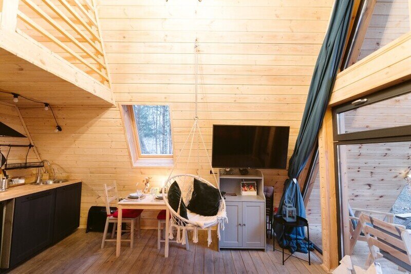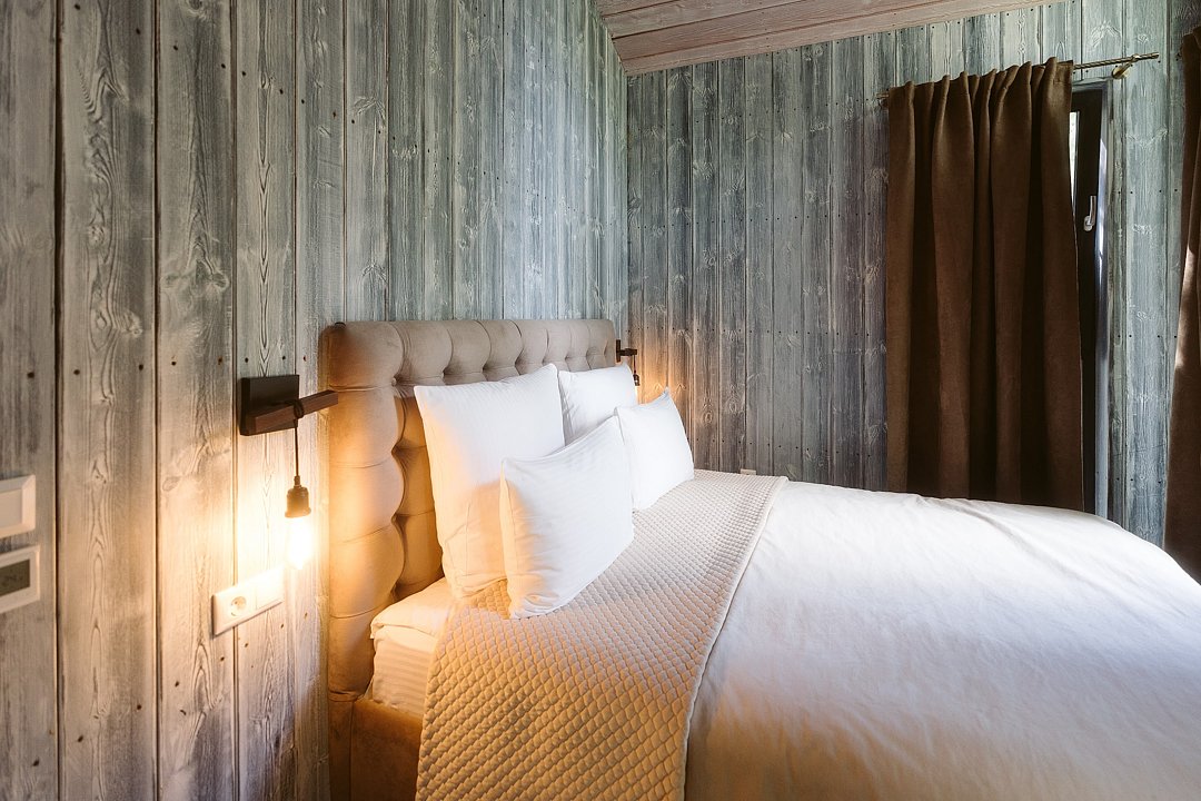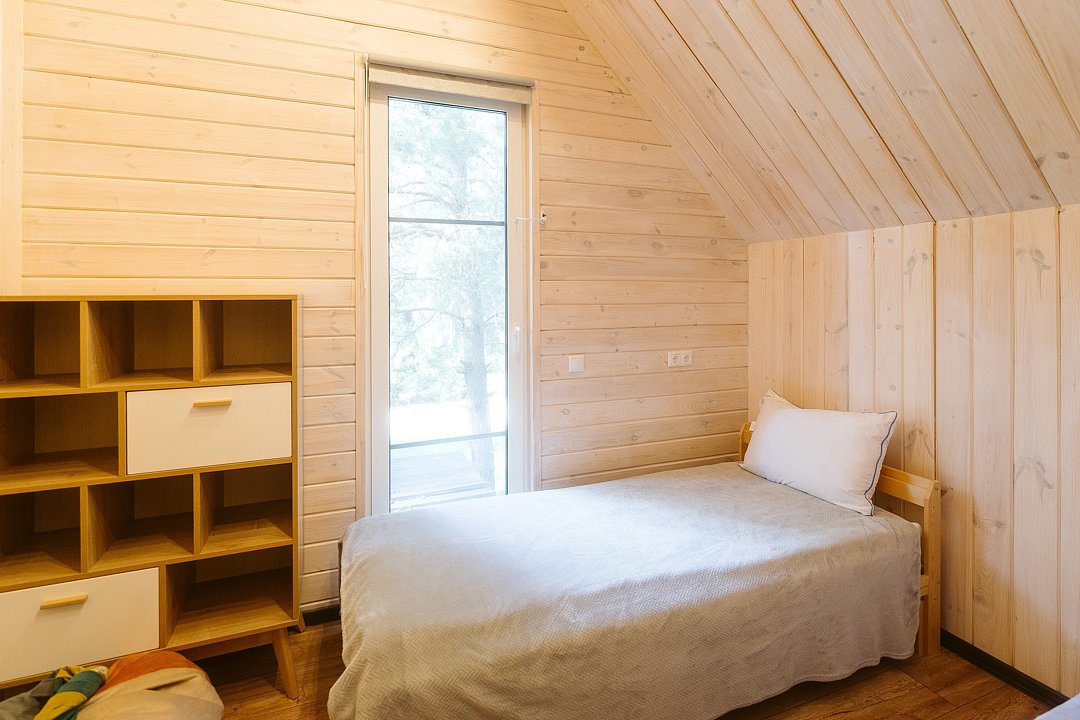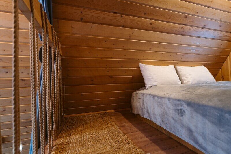 К проживанию предлагаются уютные домики вместительностью от 2 до 6 человек. Вам не придется переживать о комфорте, ведь каждый домик оснащен мягкой кроватью для хорошего и крепкого сна, ванной комнатой с туалетными принадлежностями и феном. Кухня оборудована современной бытовой техникой, чтоб гости смогли самостоятельно готовить любимые блюда. Помимо этого, в домах есть телевизор со Smart TV, кондиционер и Wi-Fi.