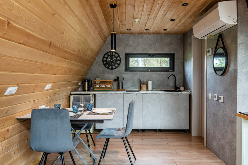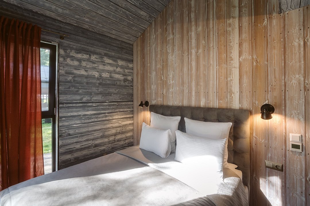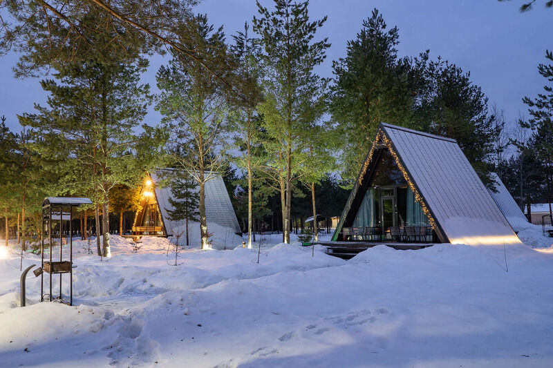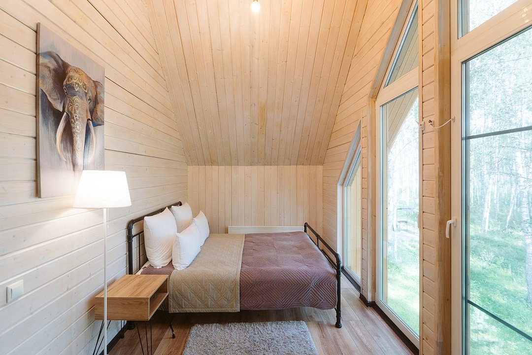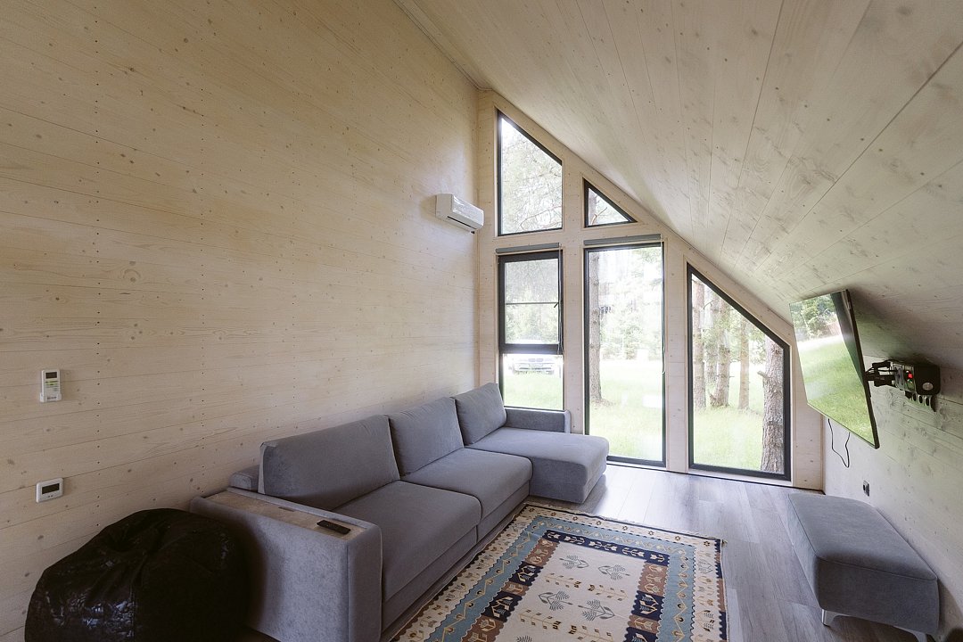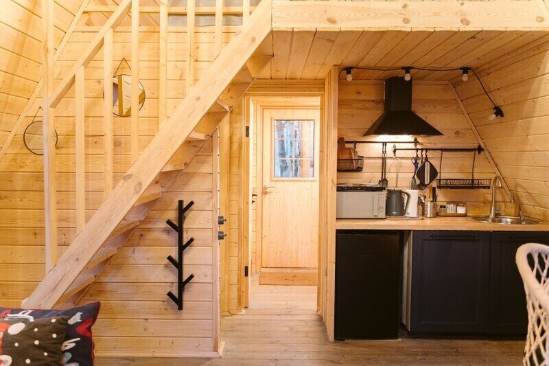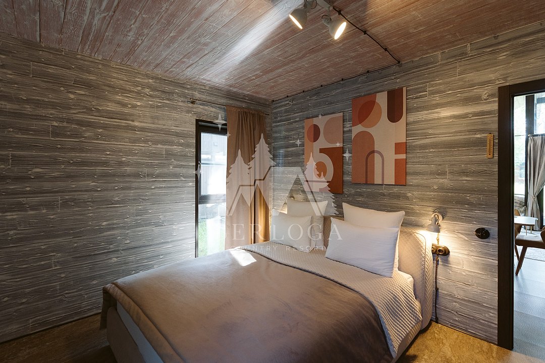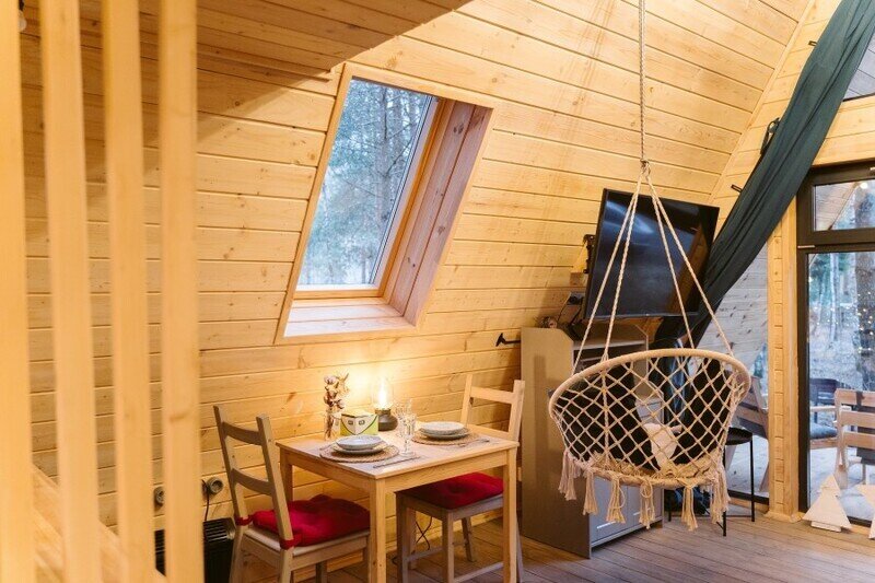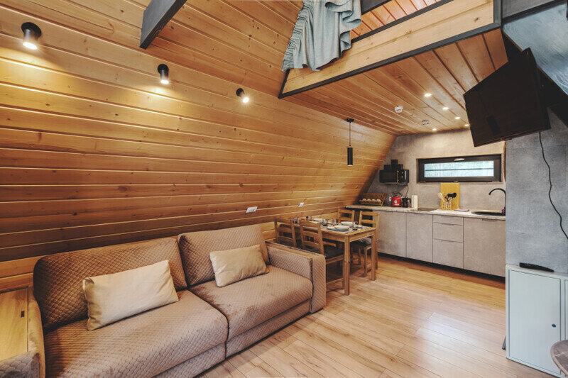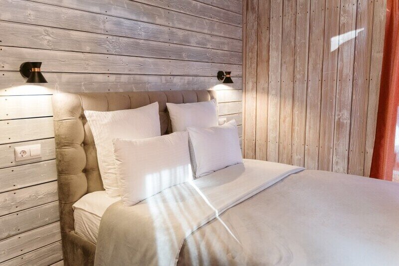 К проживанию предлагаются уютные домики вместительностью от 2 до 6 человек. Вам не придется переживать о комфорте, ведь каждый домик оснащен мягкой кроватью для хорошего и крепкого сна, ванной комнатой с туалетными принадлежностями и феном. Кухня оборудована современной бытовой техникой, чтоб гости смогли самостоятельно готовить любимые блюда. Помимо этого, в домах есть телевизор со Smart TV, кондиционер и Wi-Fi.