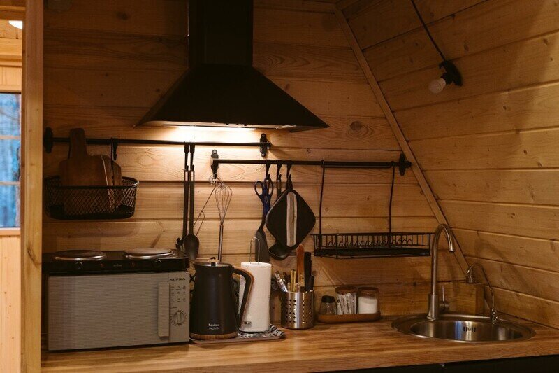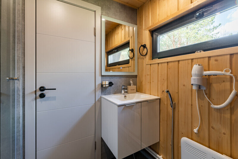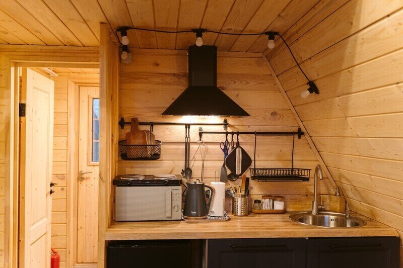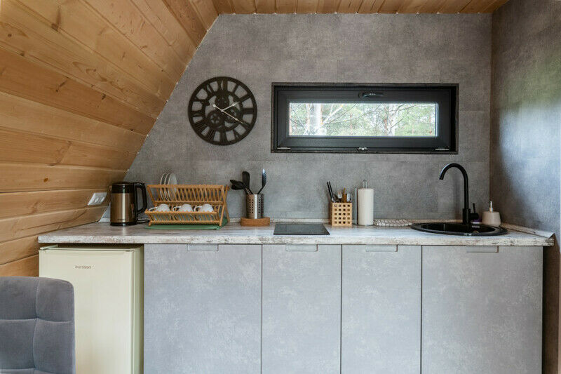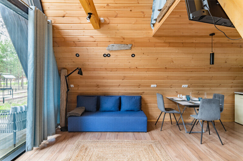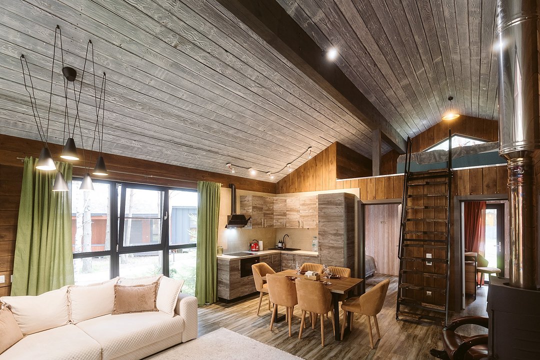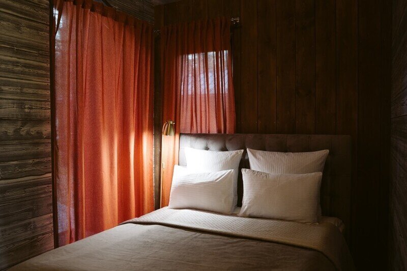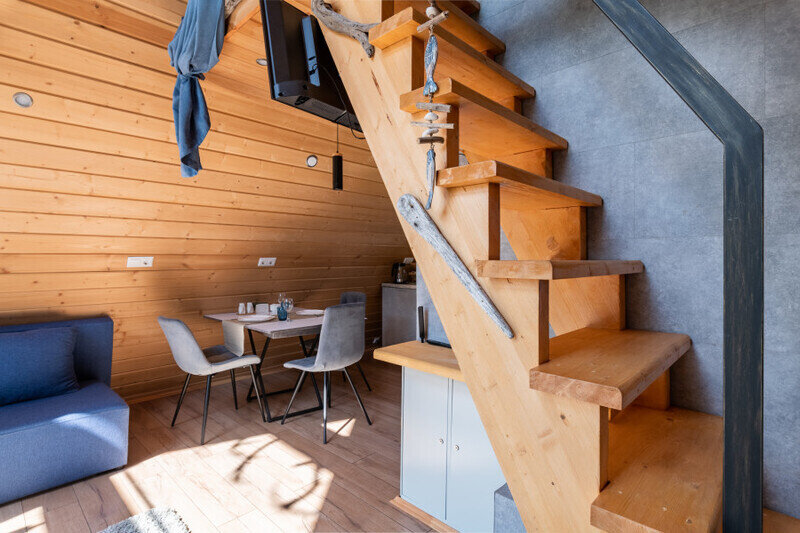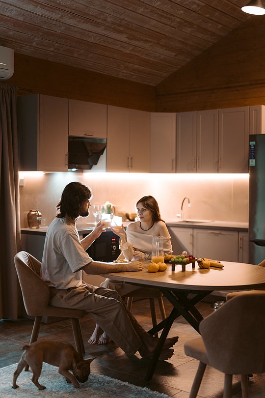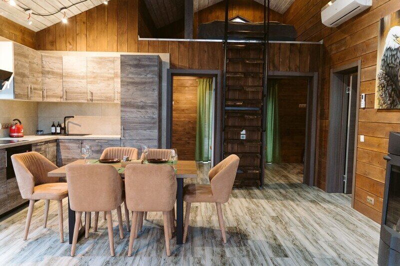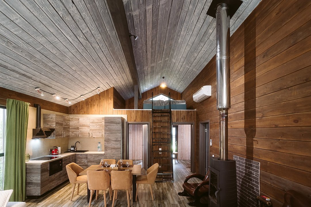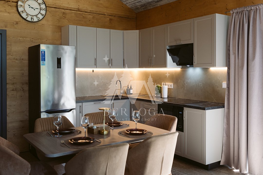 К проживанию предлагаются уютные домики вместительностью от 2 до 6 человек. Вам не придется переживать о комфорте, ведь каждый домик оснащен мягкой кроватью для хорошего и крепкого сна, ванной комнатой с туалетными принадлежностями и феном. Кухня оборудована современной бытовой техникой, чтоб гости смогли самостоятельно готовить любимые блюда. Помимо этого, в домах есть телевизор со Smart TV, кондиционер и Wi-Fi.