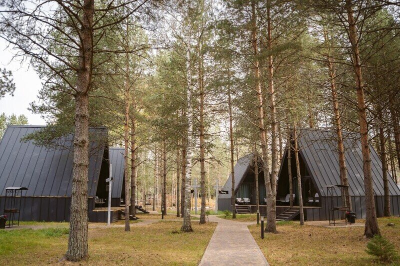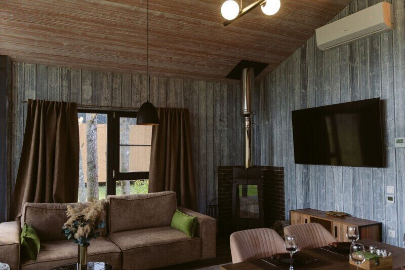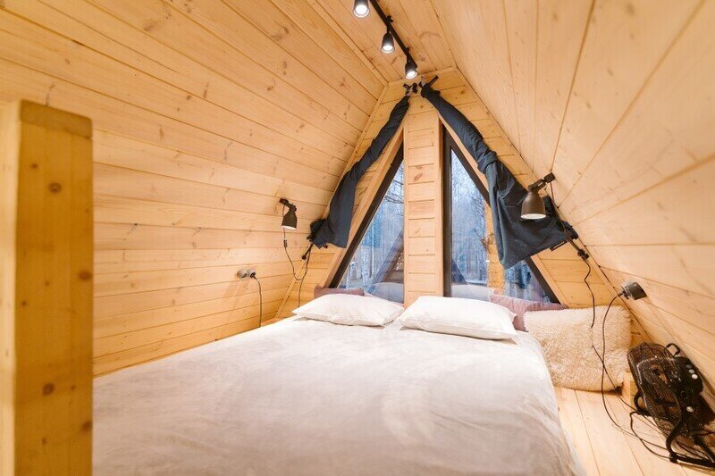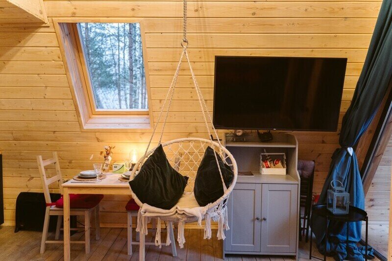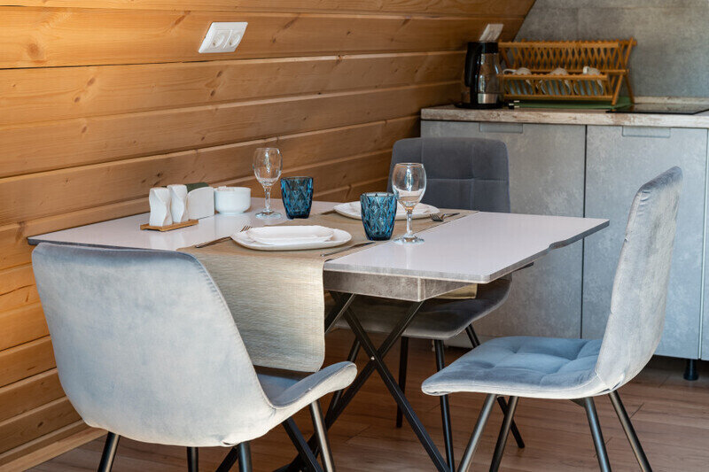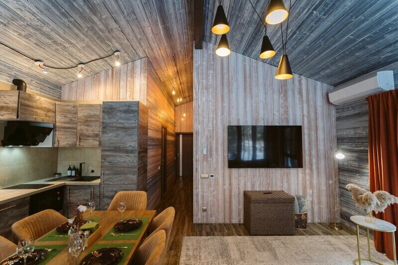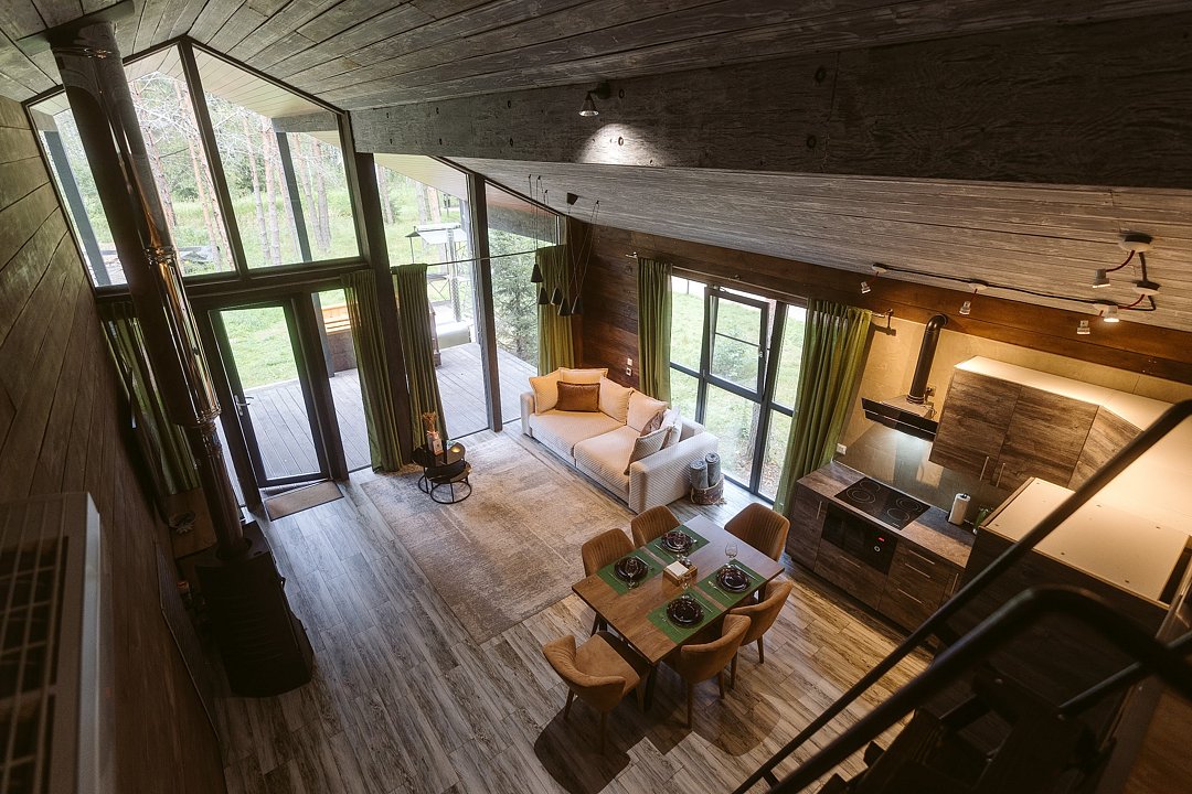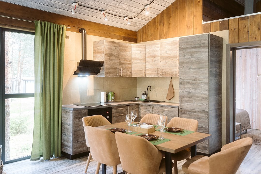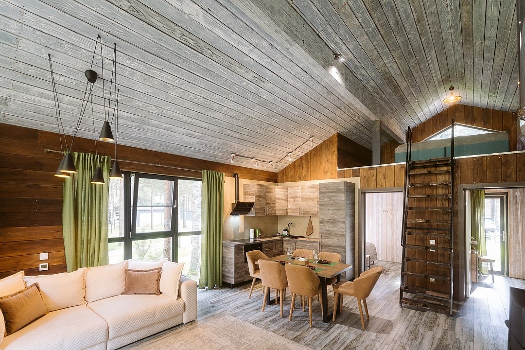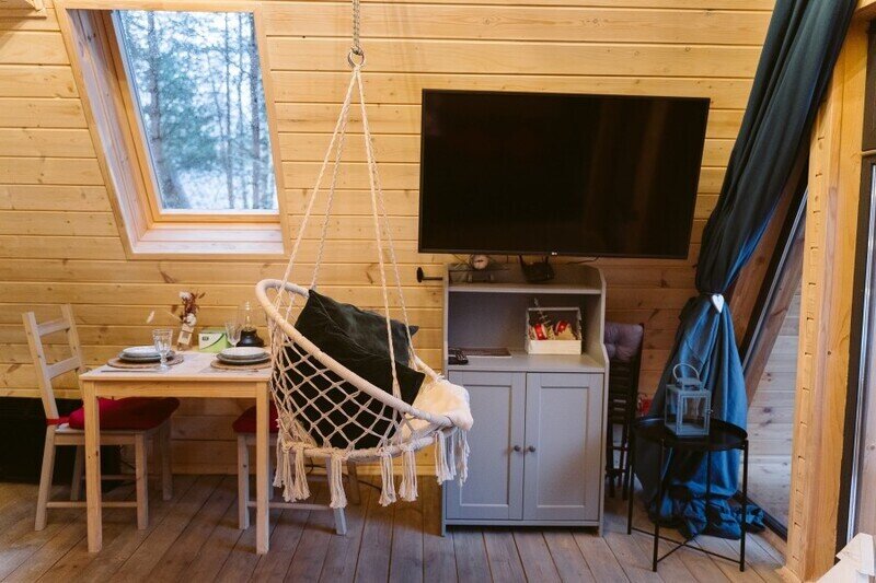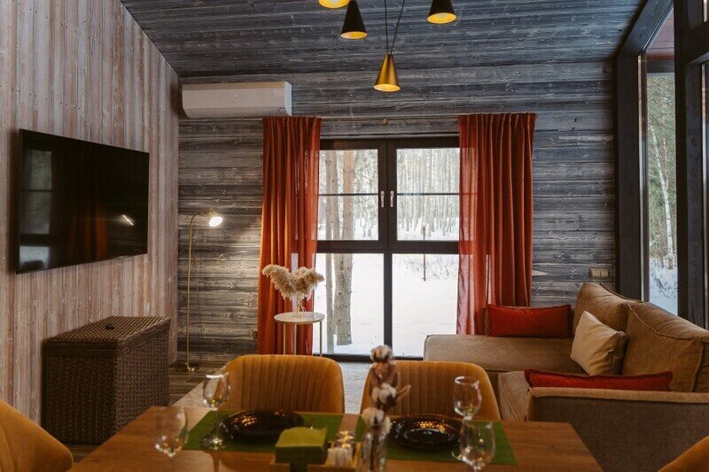 К проживанию предлагаются уютные домики вместительностью от 2 до 6 человек. Вам не придется переживать о комфорте, ведь каждый домик оснащен мягкой кроватью для хорошего и крепкого сна, ванной комнатой с туалетными принадлежностями и феном. Кухня оборудована современной бытовой техникой, чтоб гости смогли самостоятельно готовить любимые блюда. Помимо этого, в домах есть телевизор со Smart TV, кондиционер и Wi-Fi.