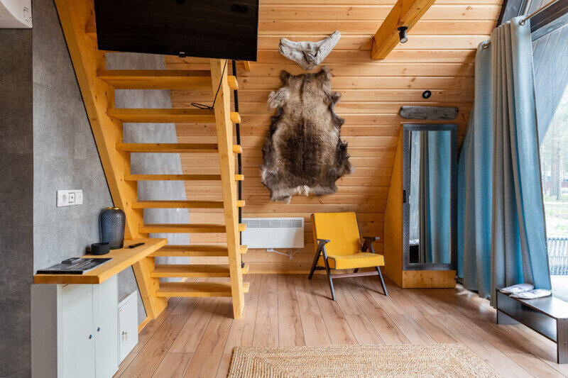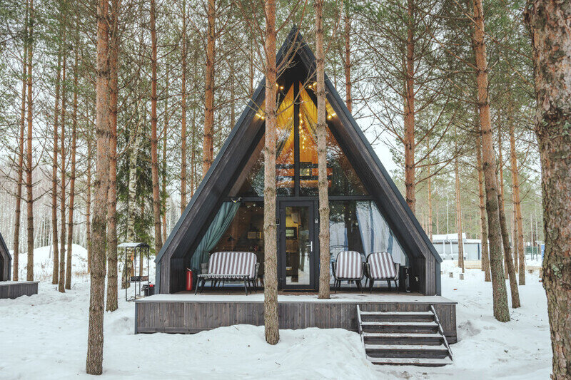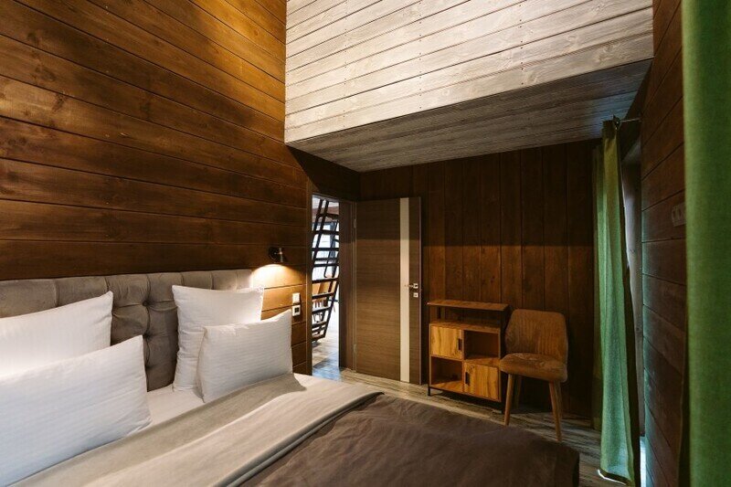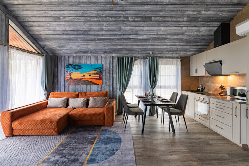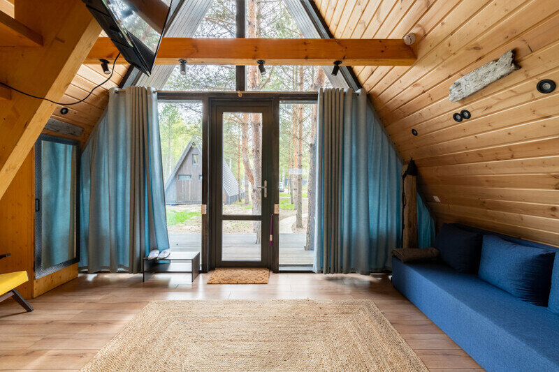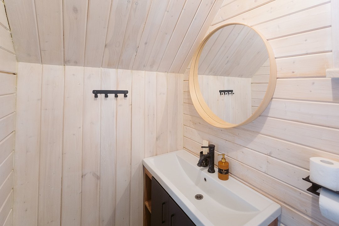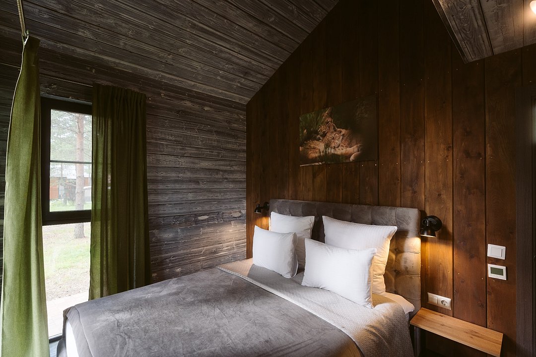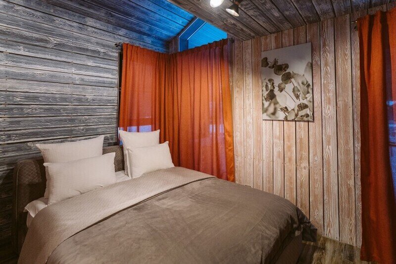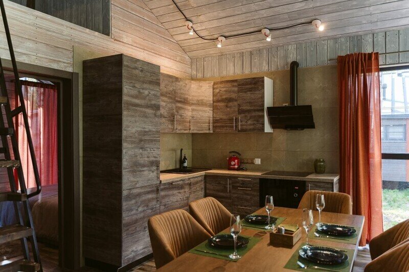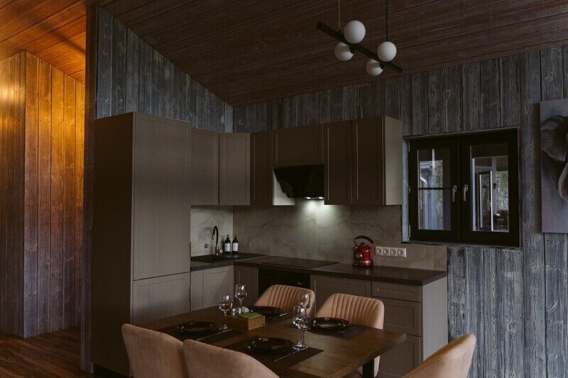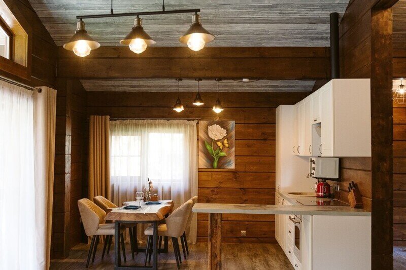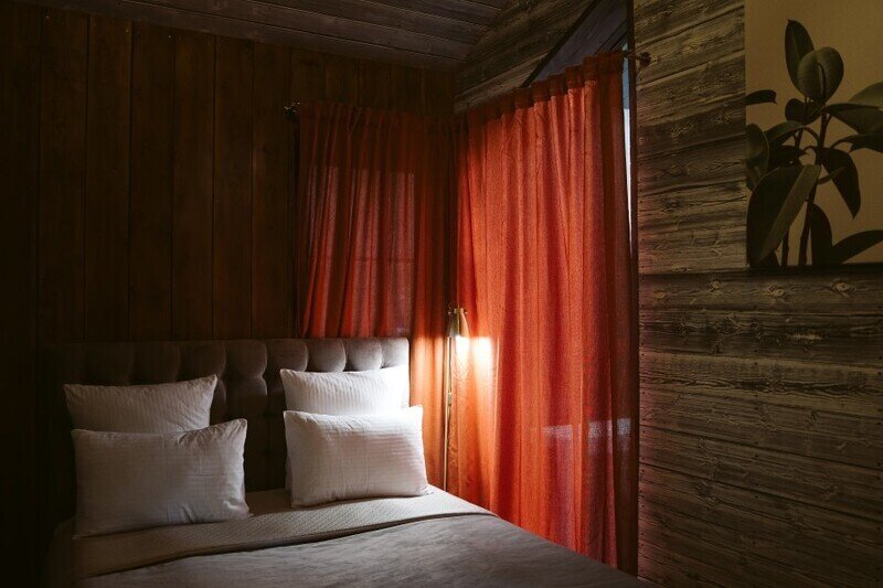 К проживанию предлагаются уютные домики вместительностью от 2 до 6 человек. Вам не придется переживать о комфорте, ведь каждый домик оснащен мягкой кроватью для хорошего и крепкого сна, ванной комнатой с туалетными принадлежностями и феном. Кухня оборудована современной бытовой техникой, чтоб гости смогли самостоятельно готовить любимые блюда. Помимо этого, в домах есть телевизор со Smart TV, кондиционер и Wi-Fi.