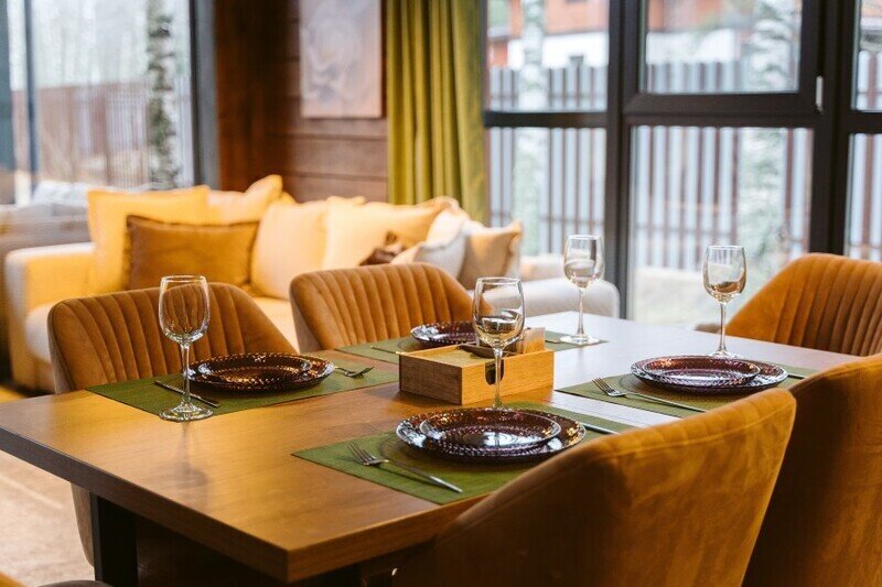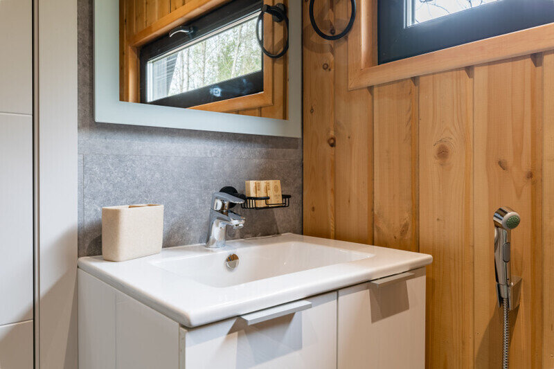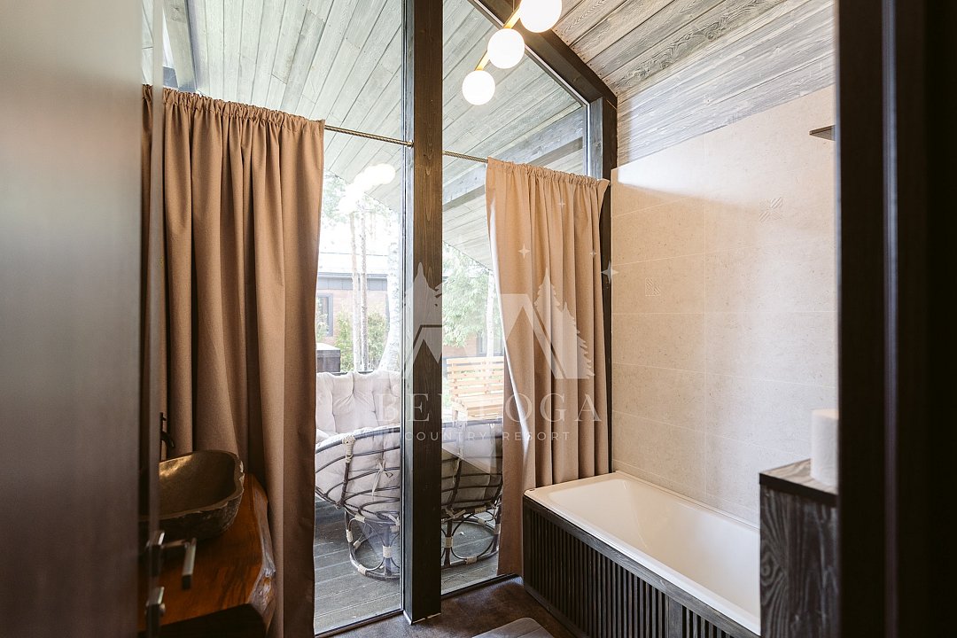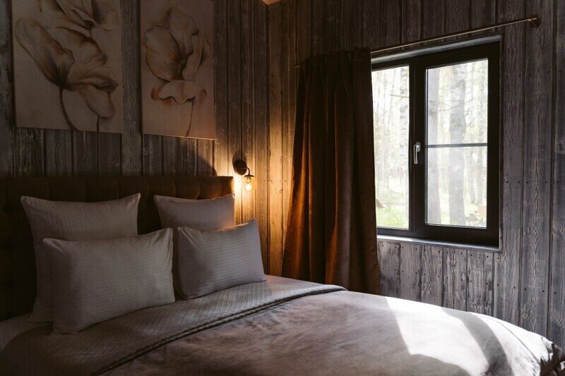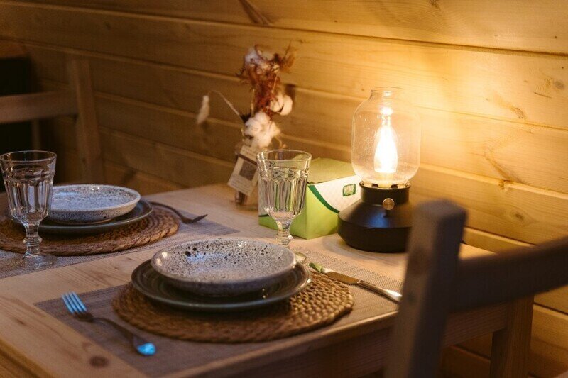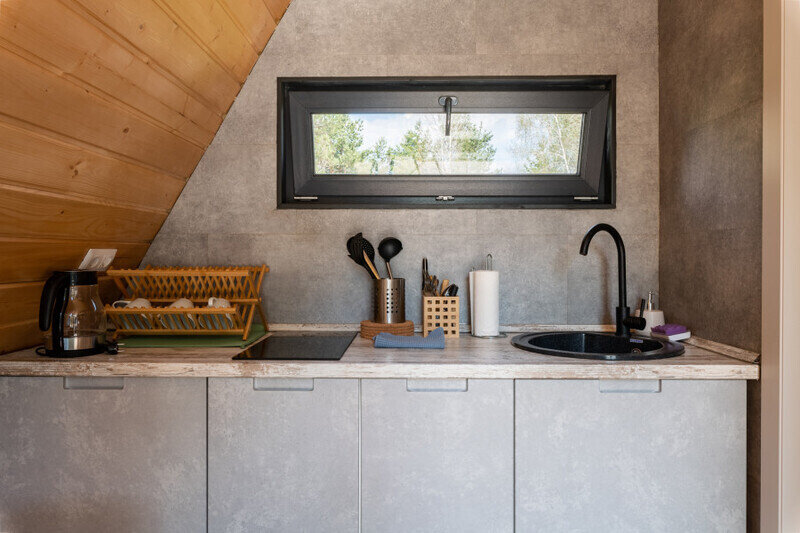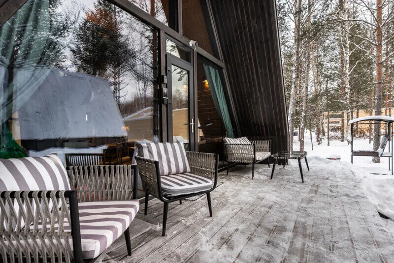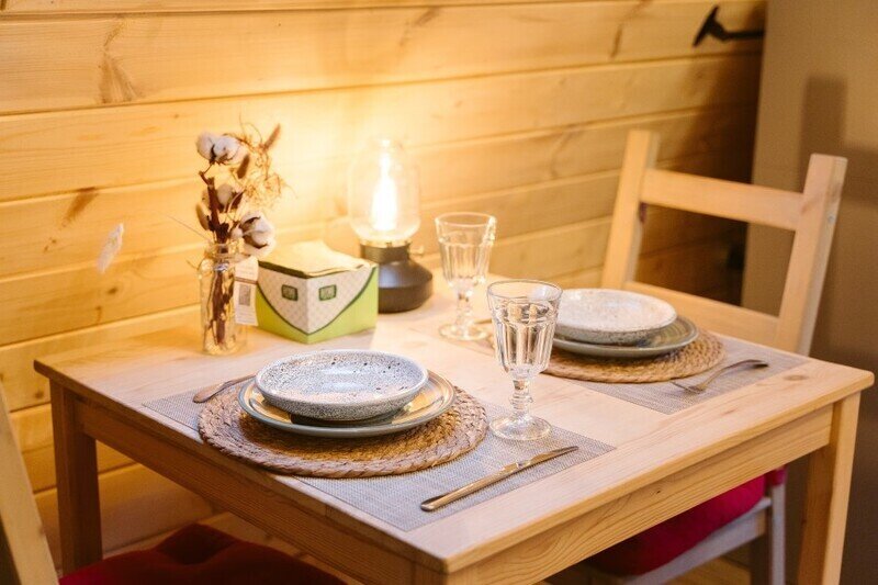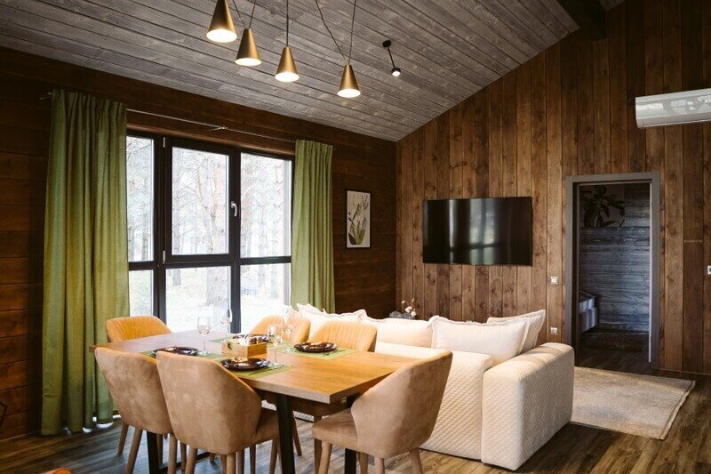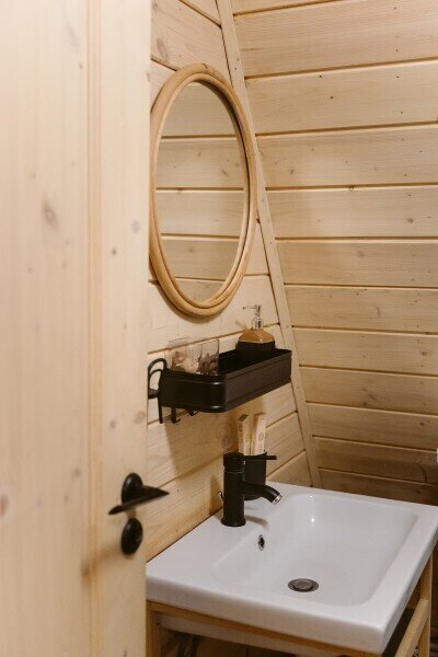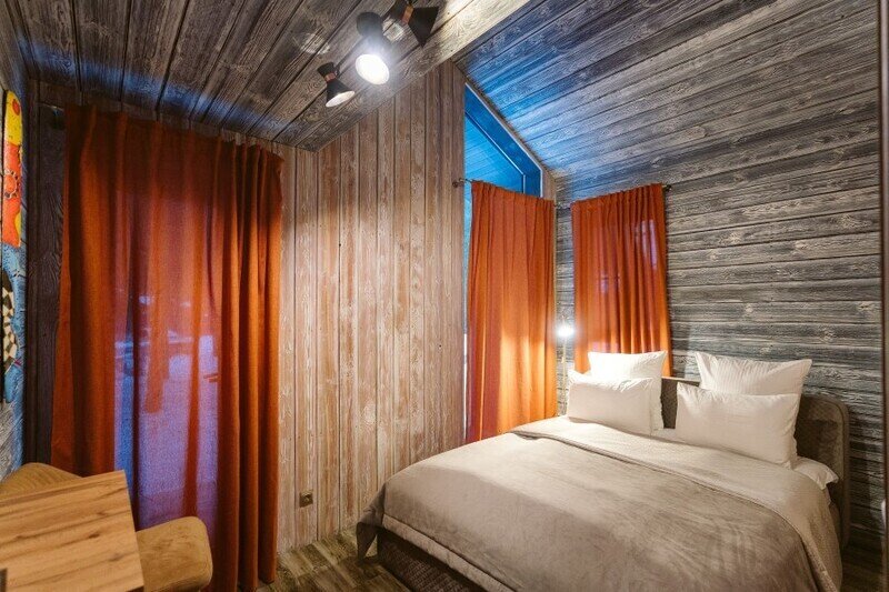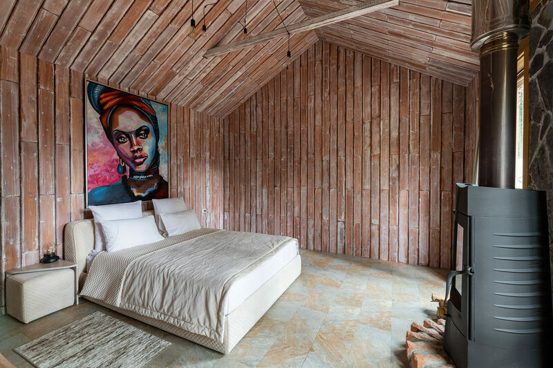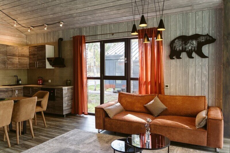 К проживанию предлагаются уютные домики вместительностью от 2 до 6 человек. Вам не придется переживать о комфорте, ведь каждый домик оснащен мягкой кроватью для хорошего и крепкого сна, ванной комнатой с туалетными принадлежностями и феном. Кухня оборудована современной бытовой техникой, чтоб гости смогли самостоятельно готовить любимые блюда. Помимо этого, в домах есть телевизор со Smart TV, кондиционер и Wi-Fi.