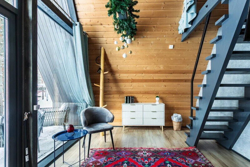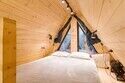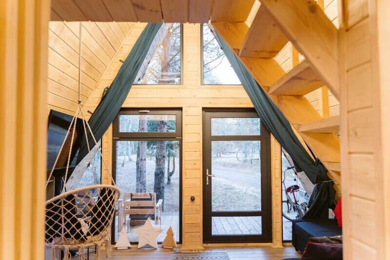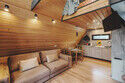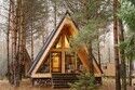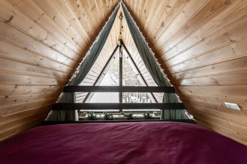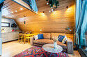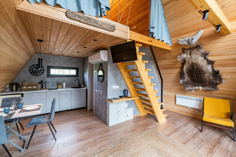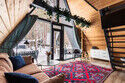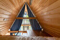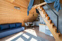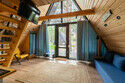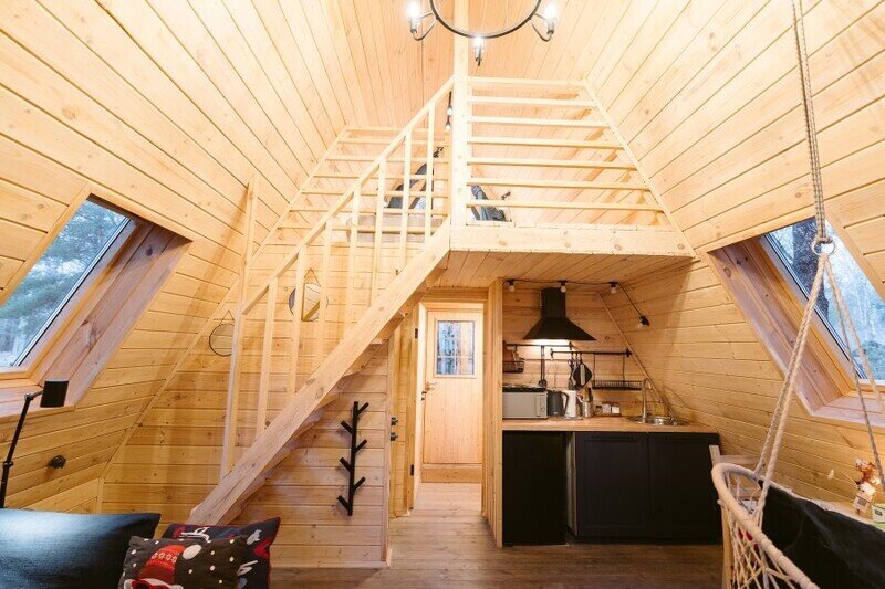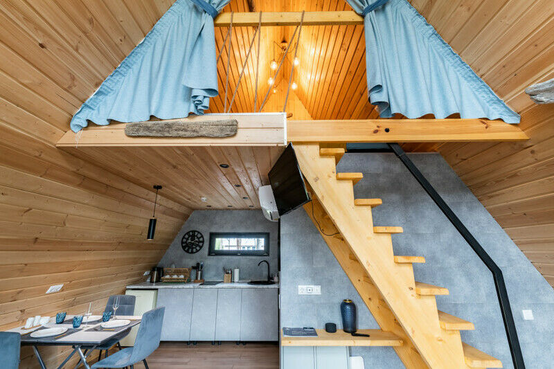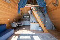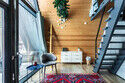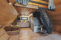 Двухэтажный дом A-Frame с лестницей вверх с кроватью KingSize и просторной кухней гостиной с диваном кроватью.