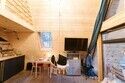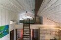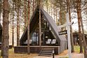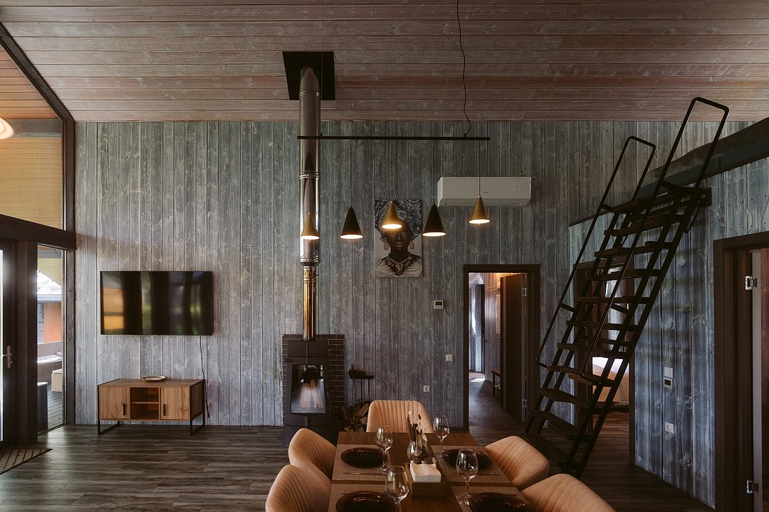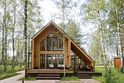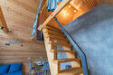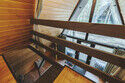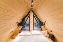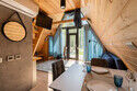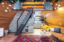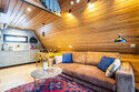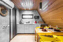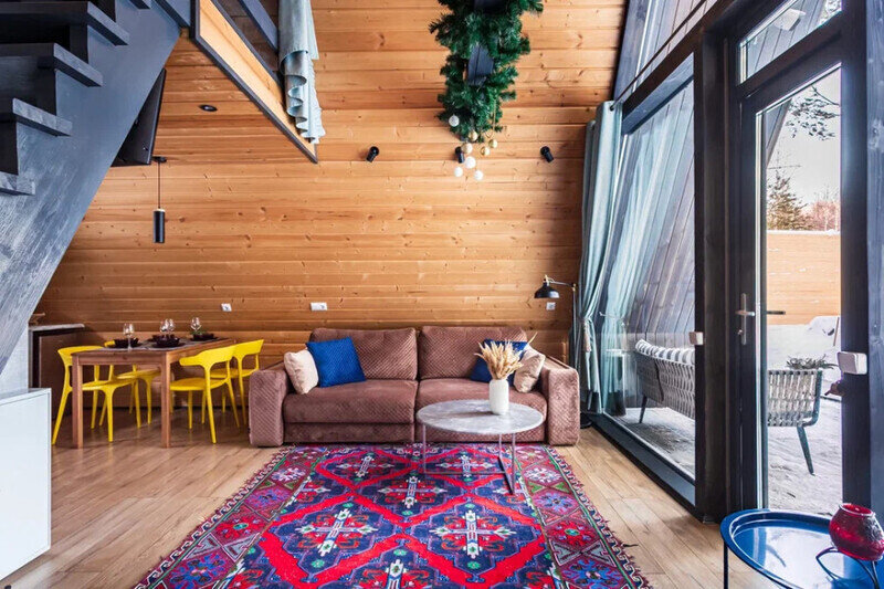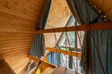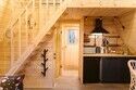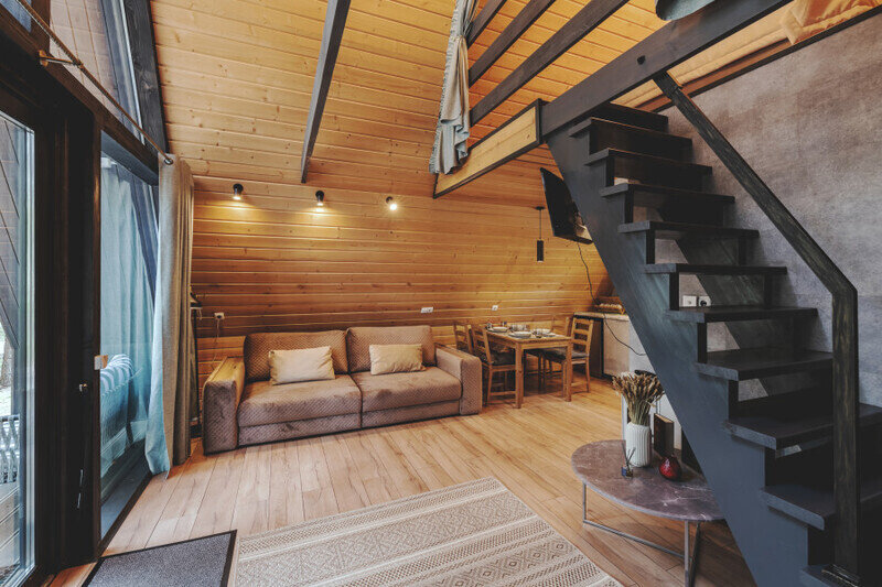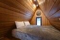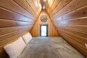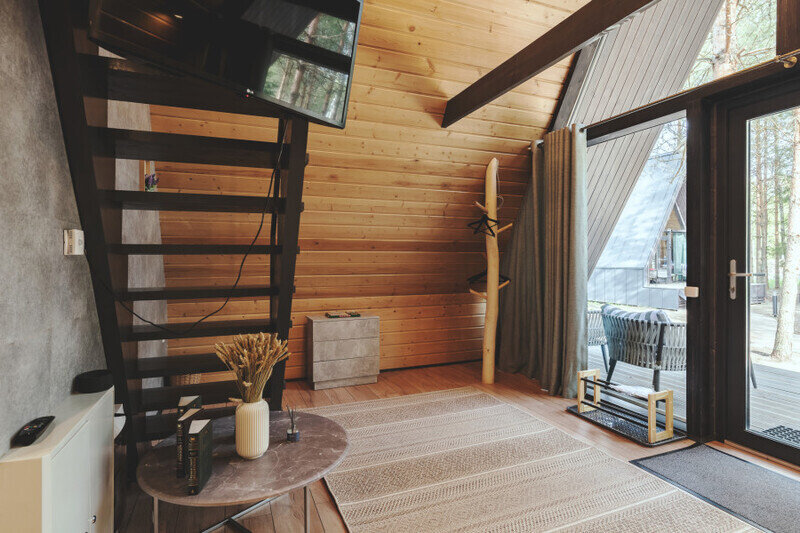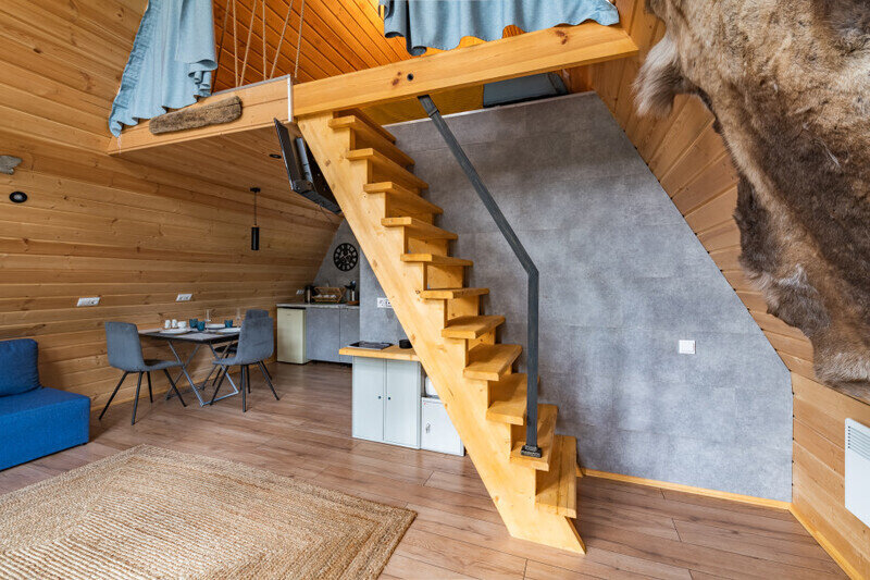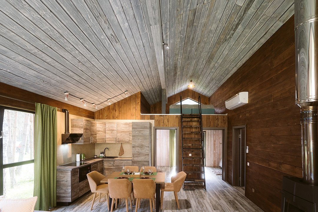 Двухэтажный дом A-Frame с лестницей вверх с кроватью KingSize и просторной кухней гостиной с диваном кроватью.
